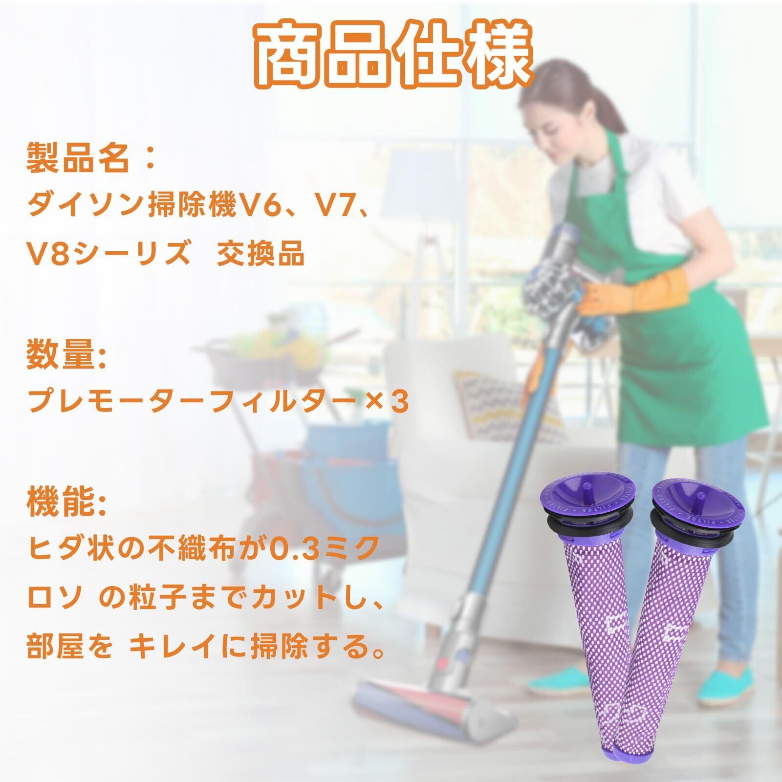 【商品仕様】製品名:ダイソン掃除機V6、V7、V8シーリズ交換品 材質:密度のいい静電気綿・耐久性のあるABS素材 数量:プレモーターフィルター×3 機能:ヒダ状の不織布が0.3ミクロソの粒子までカットし、部屋をキレイに掃除する。