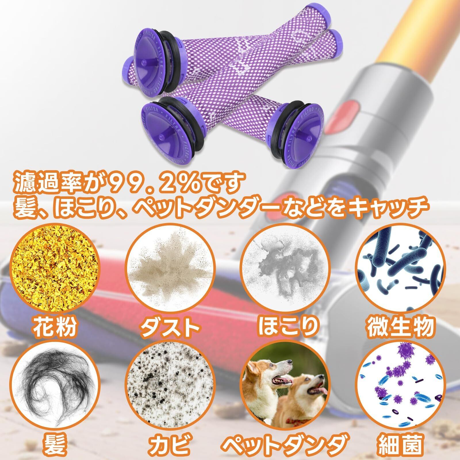 【優れた性能】フィルターを交換後、掃除機の作動、使用感と吸い込み力が戻ります。それから、排出する空気が綺麗になり、安心できます。床に付着しているホコリ、花粉、ペットの毛やフケなどのアレルゲン物質とバクテリアをしっかり捕まえます。