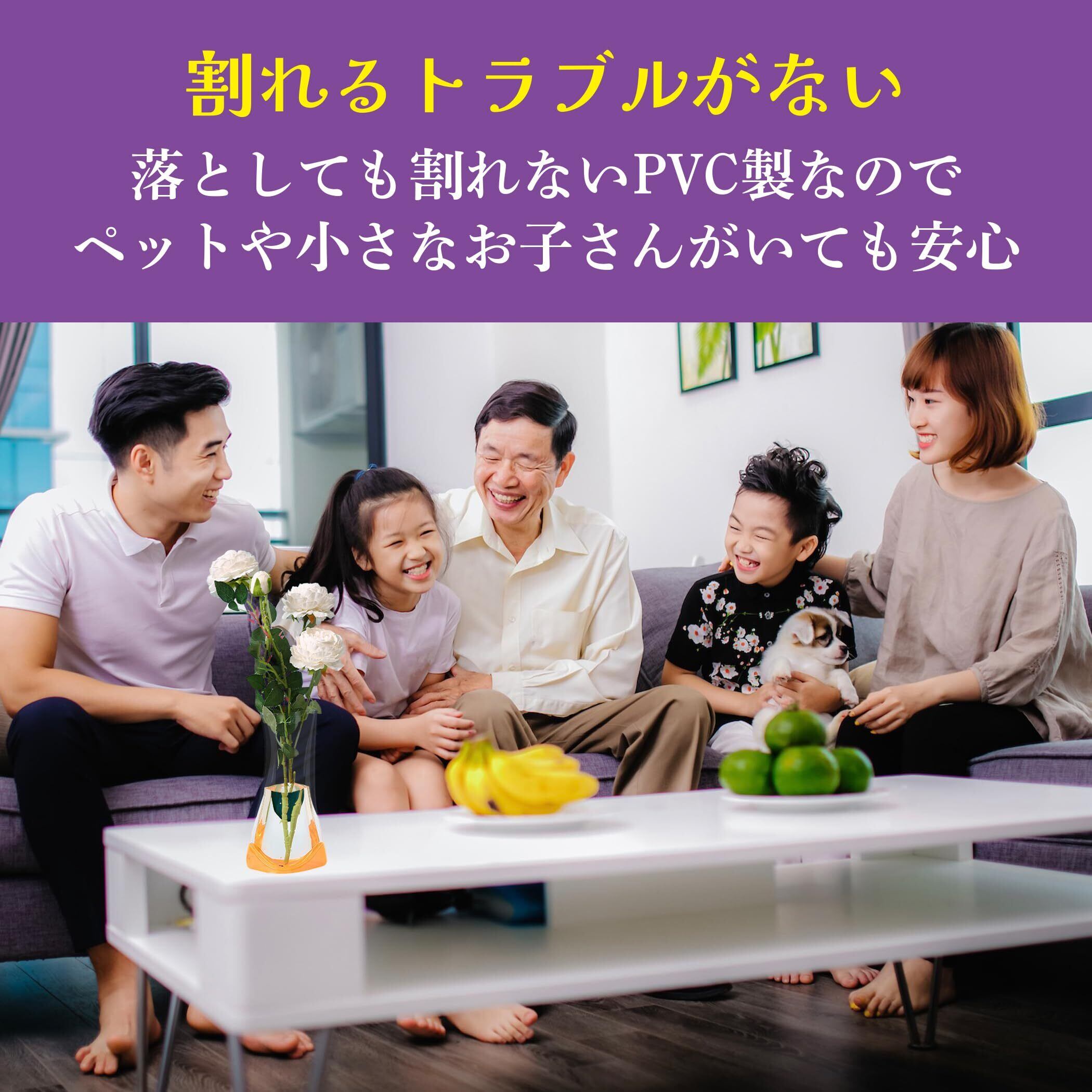 【割れない折りたたみ式花瓶】PVC製の折りたたみ花瓶は、誤って落としても割れることがないので、テーブルやデスク上でのお花の飾りつけにも安心です。割れない素材で、ペットや小さなお子様がいる家庭でも安心して使えます。