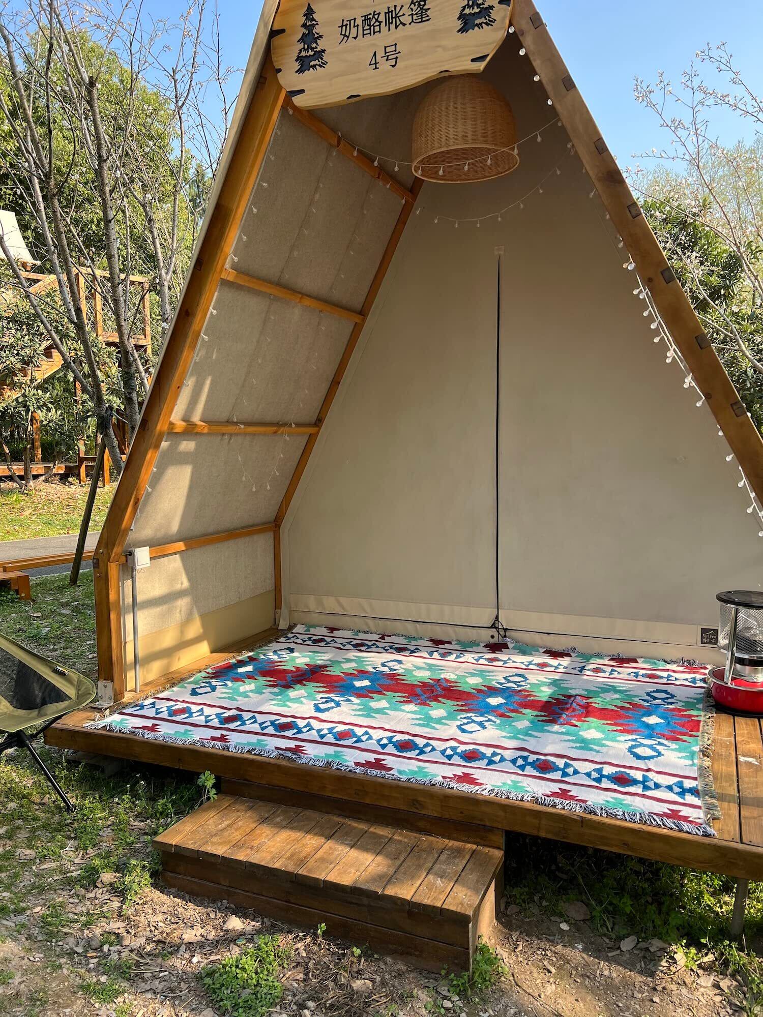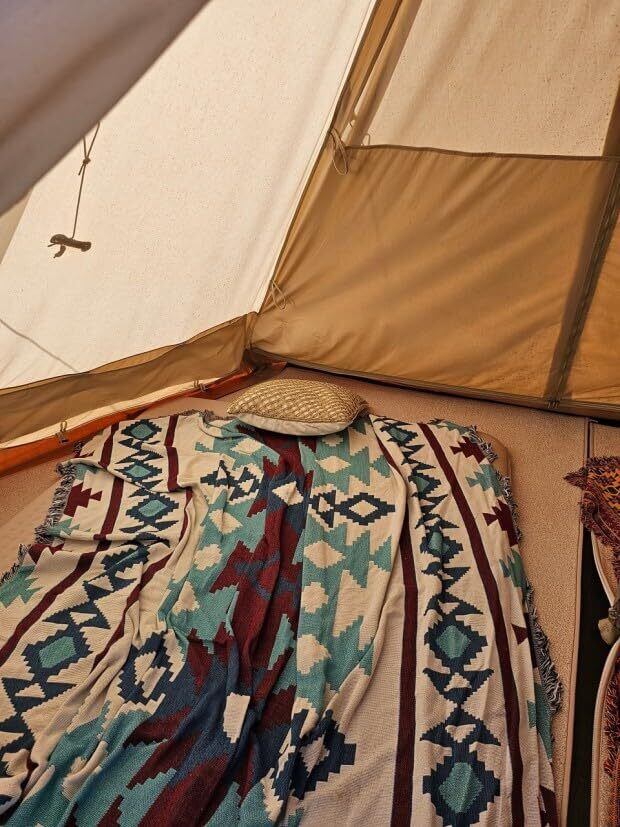 大判のメキシカンラグをコットの上に敷くだけで、まるで先住民が生活しているような空間に。ナチュラルな色あいのテントやテーブルに、メキシカンラグの派手めなデザインがマッチしています。