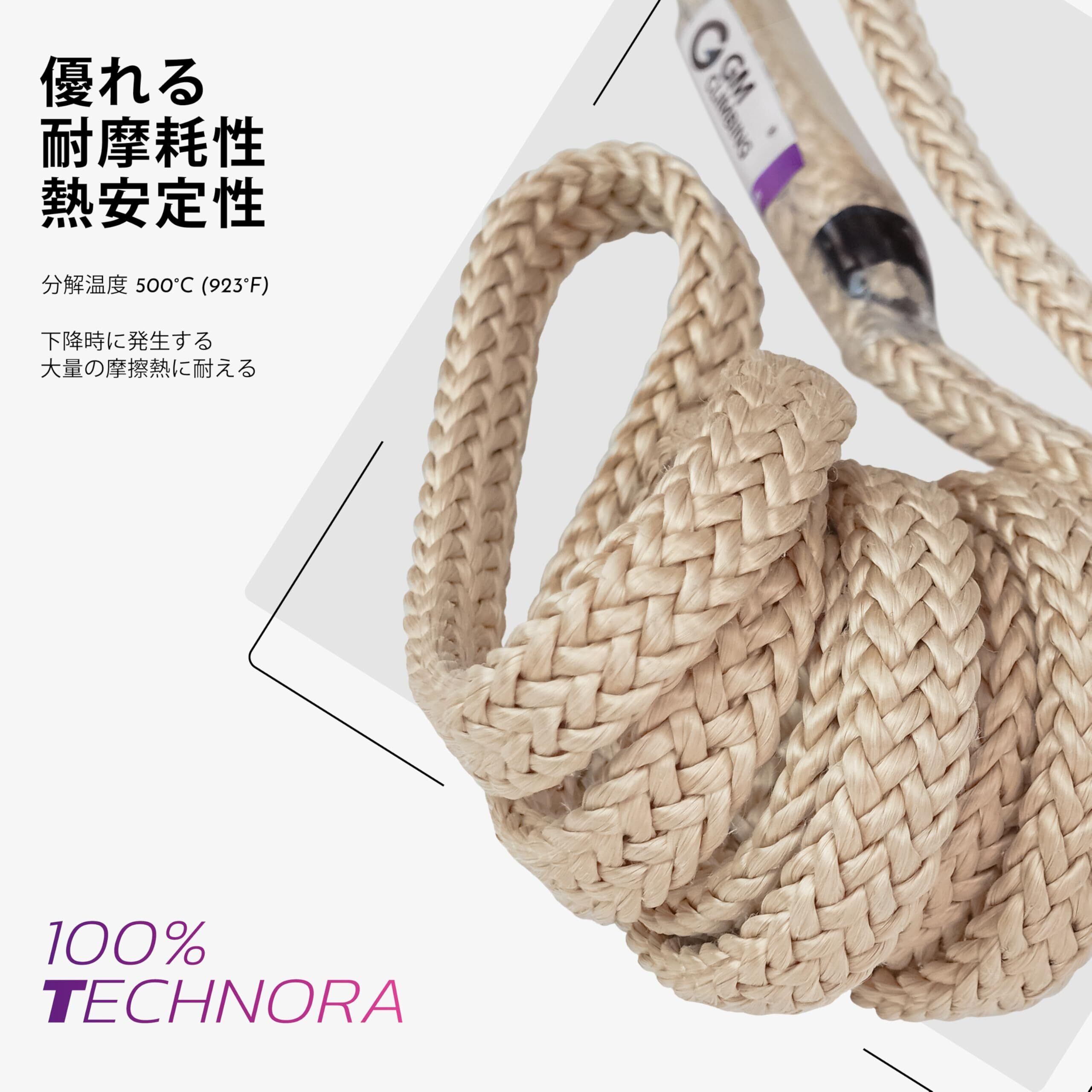 100%テクノーラ繊維◆◆プルージックコードだけでなく、縫製の補強ステッチ線も100%テクノーラ繊維を使用します。より高強力で、耐摩耗性と耐熱性に優れます。