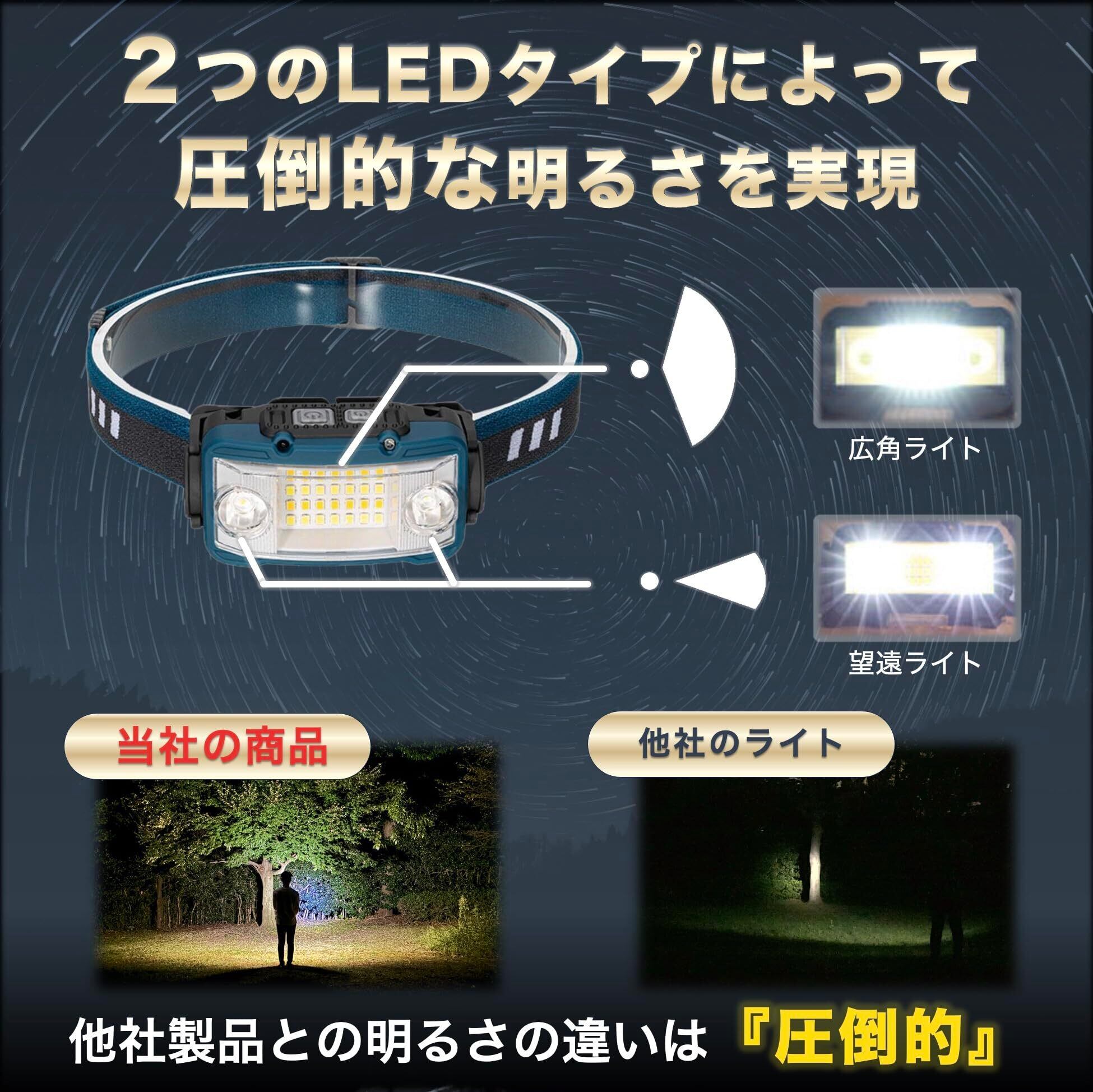 広角・望遠両用:広角ライトと望遠ライトを搭載することで、遠近両方を照らすことができます。片方だけ使用することも可能なので、利用シーンに応じて照らす範囲を変更できます。