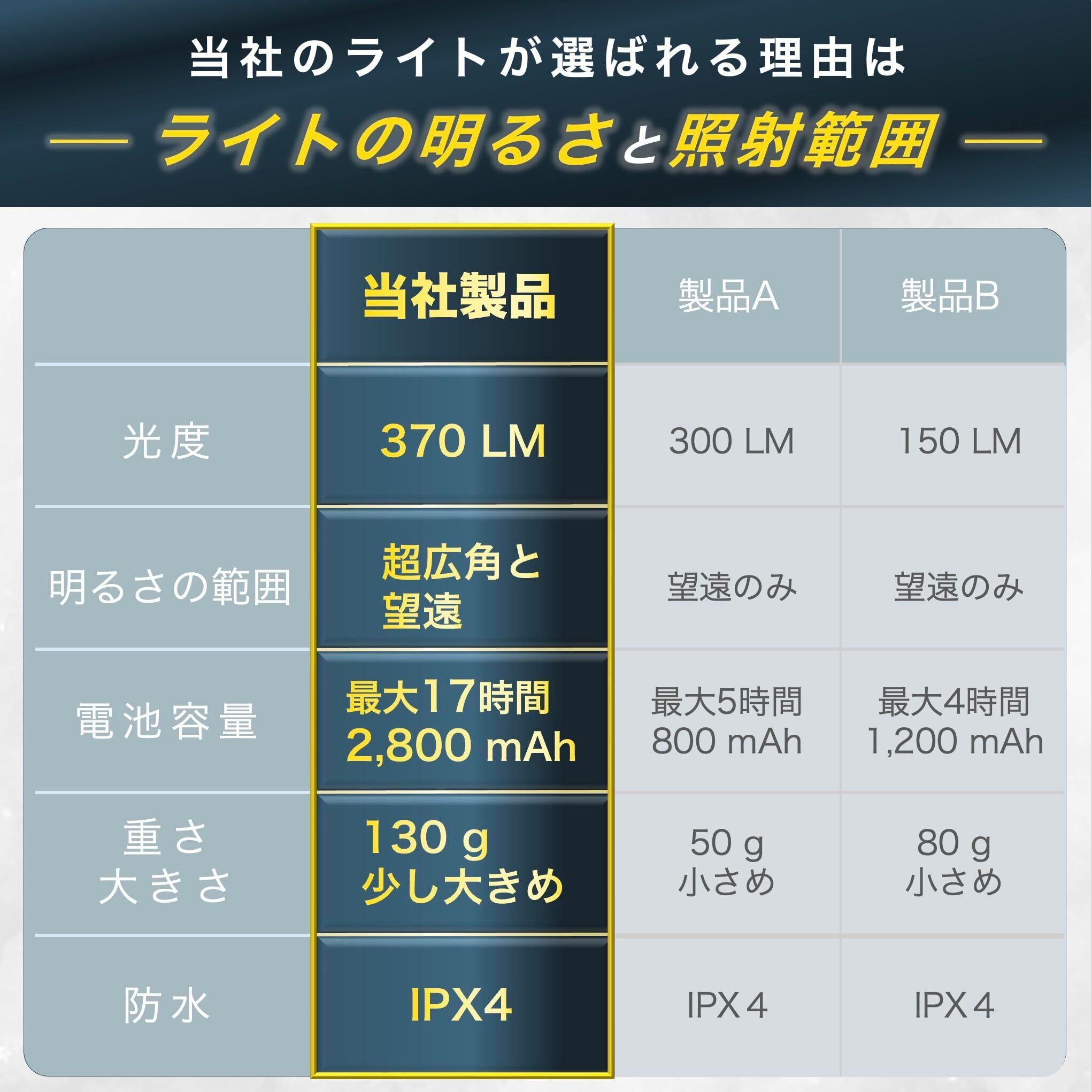 重さは約130g:超高光度・大容量にも関わらず、約130gの重さです。頭に長時間装着していても、負担になりづらく、持ち運びも簡単にできます。