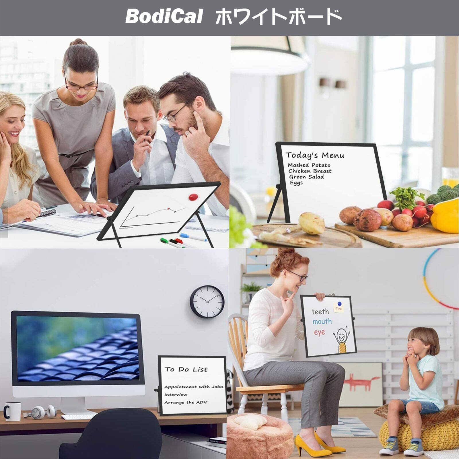 板面にはマグネットを取り付けることができます。メモやプリントを貼ることができるので、掲示板、伝言板、備忘録、または店舗のメニューなどに多用途に使えます。