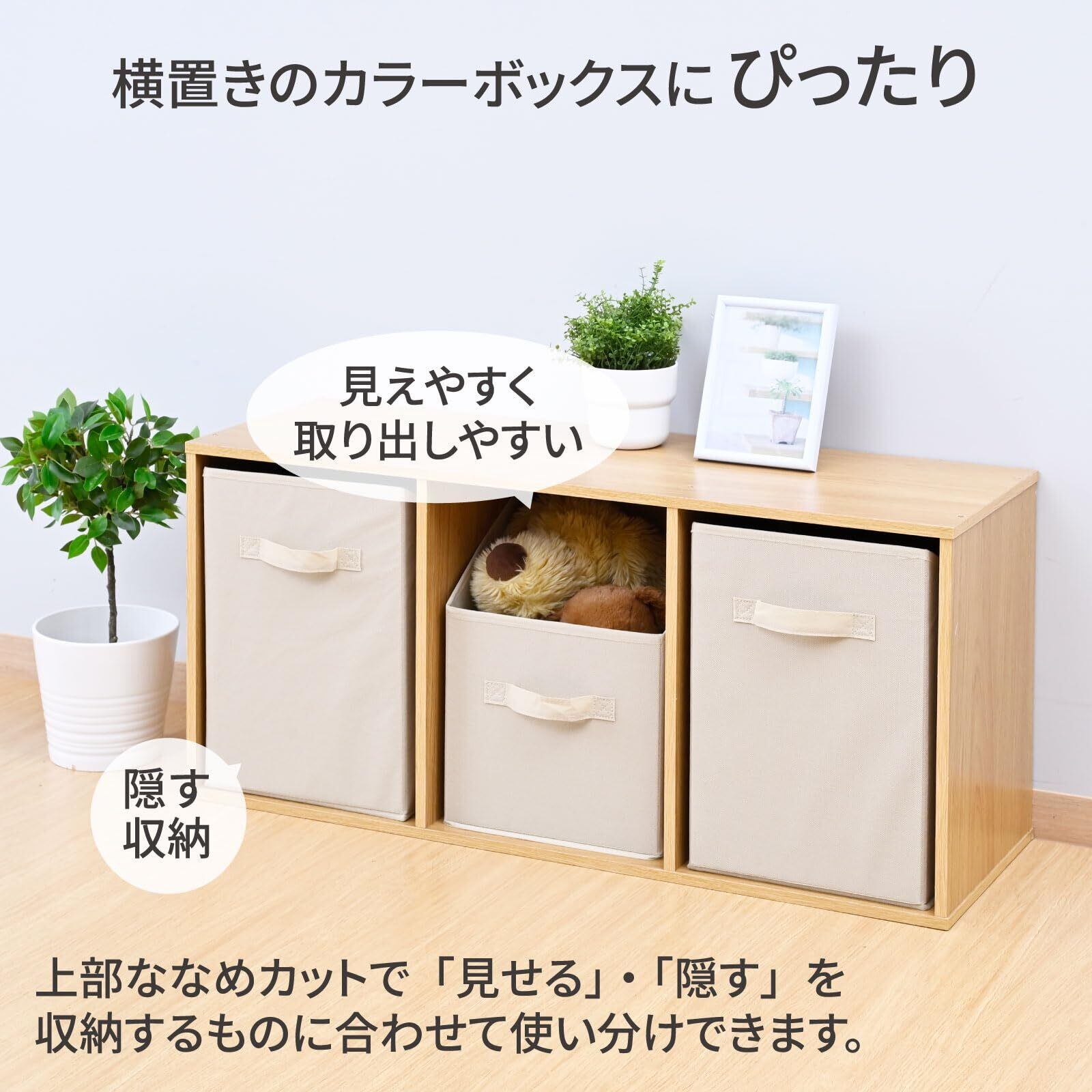 【上部ななめカット】隠す収納の時は上部が長い方を手前に、さっと取り出したい時や中身を見やすくしたい時は、上部が短い方を手前に、など使い分けることができます。
