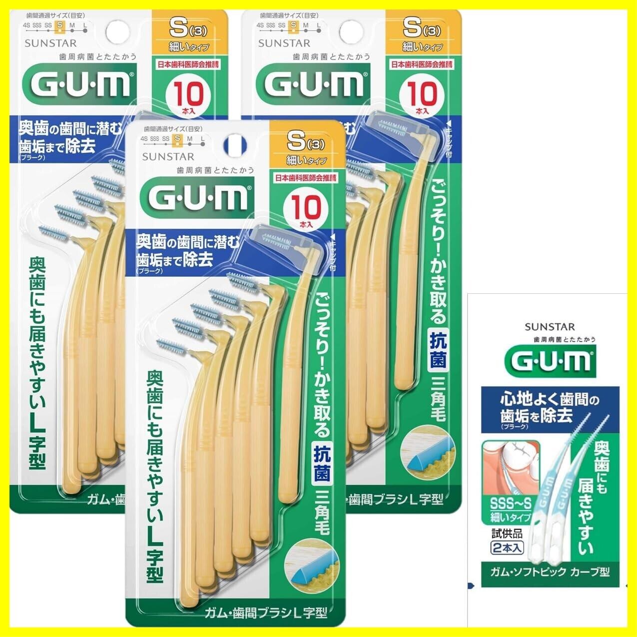GUM(ガム) 歯間ブラシ L字型 奥歯の歯間ケア ワイヤータイプ [サイズ:S (3)] 10本入×3個パック+おまけ付き