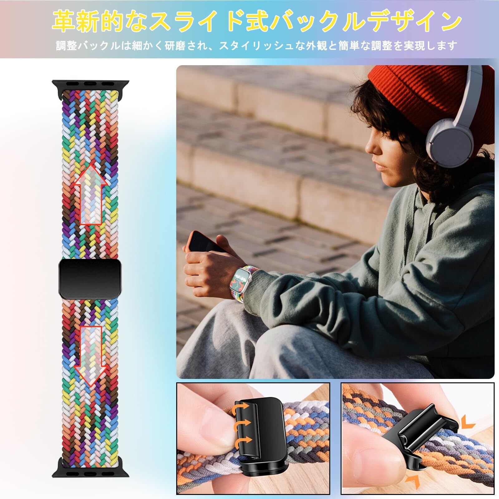 CeiBand バンド Apple Watch 41/40/38mm 用 交換ベルト 編み 腕時計バンド Apple Watch Series 9 41mm 対応 弾力性 ベルト ナイロン 編み込み 磁気吸着式バックル スポーツバンド メンズ レディース 時計バンド スマートウォッチバンド iWatch SE/SE 2/Series 10/9/8/7/6/5/4/3/2/1 -(レインボーカラー)