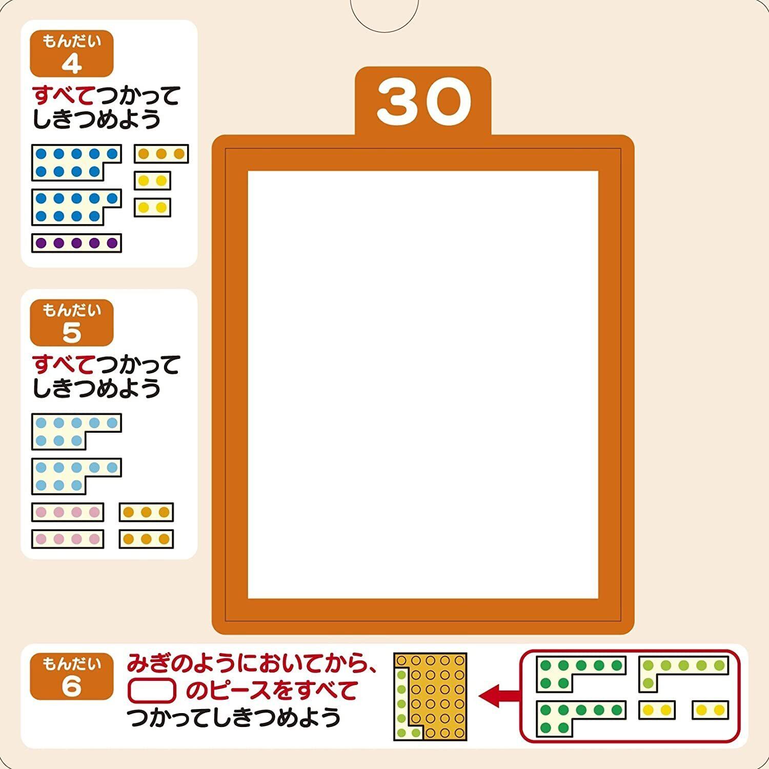 1から10の「数ピース」を組み合わせて、ボードの中にしきつめるパズルです。100個のおうとつがあるボードにしきつめるパズルで遊ぶことで、1から100までの数量の感覚を養います。