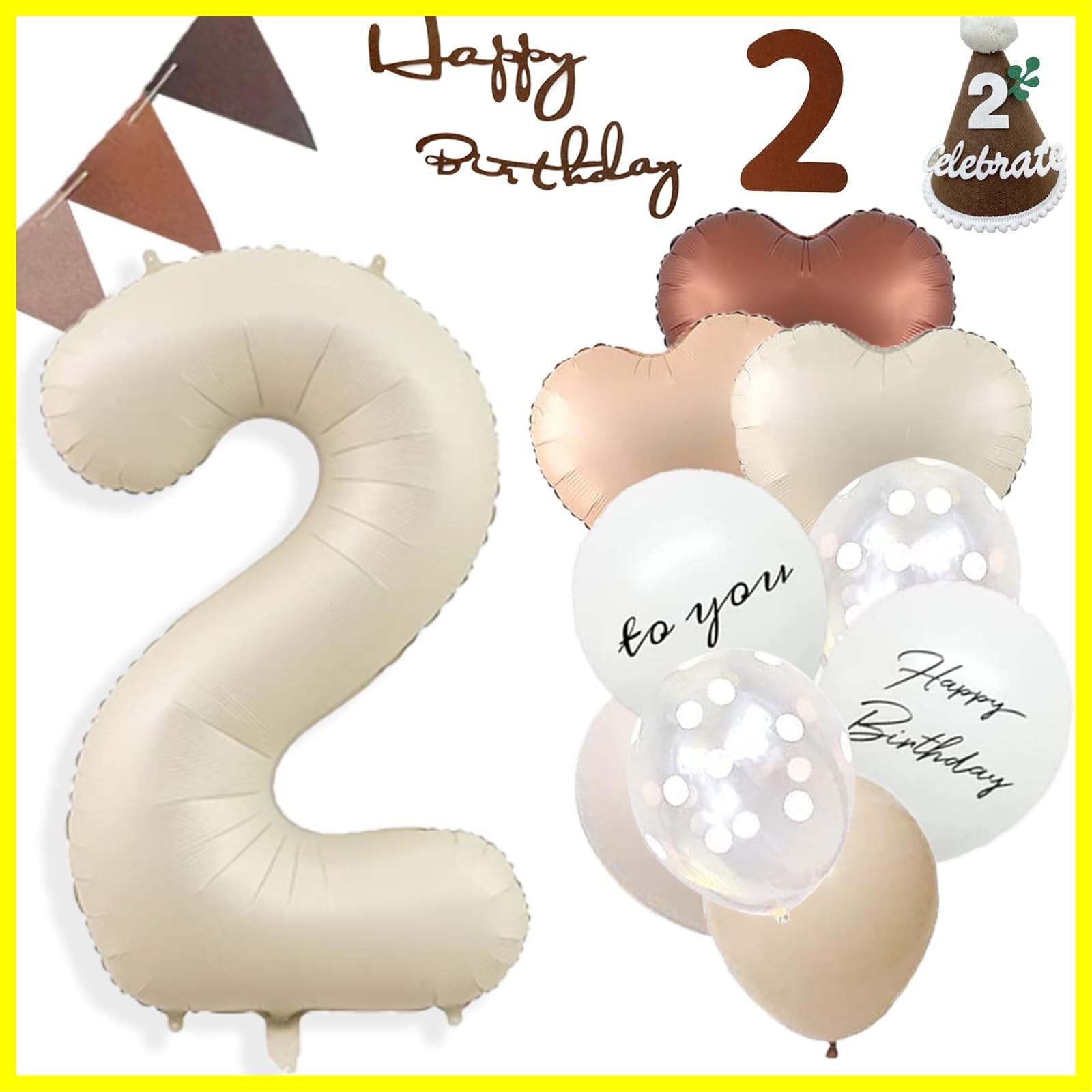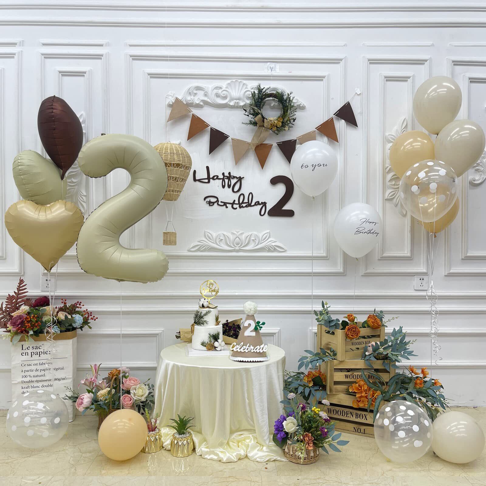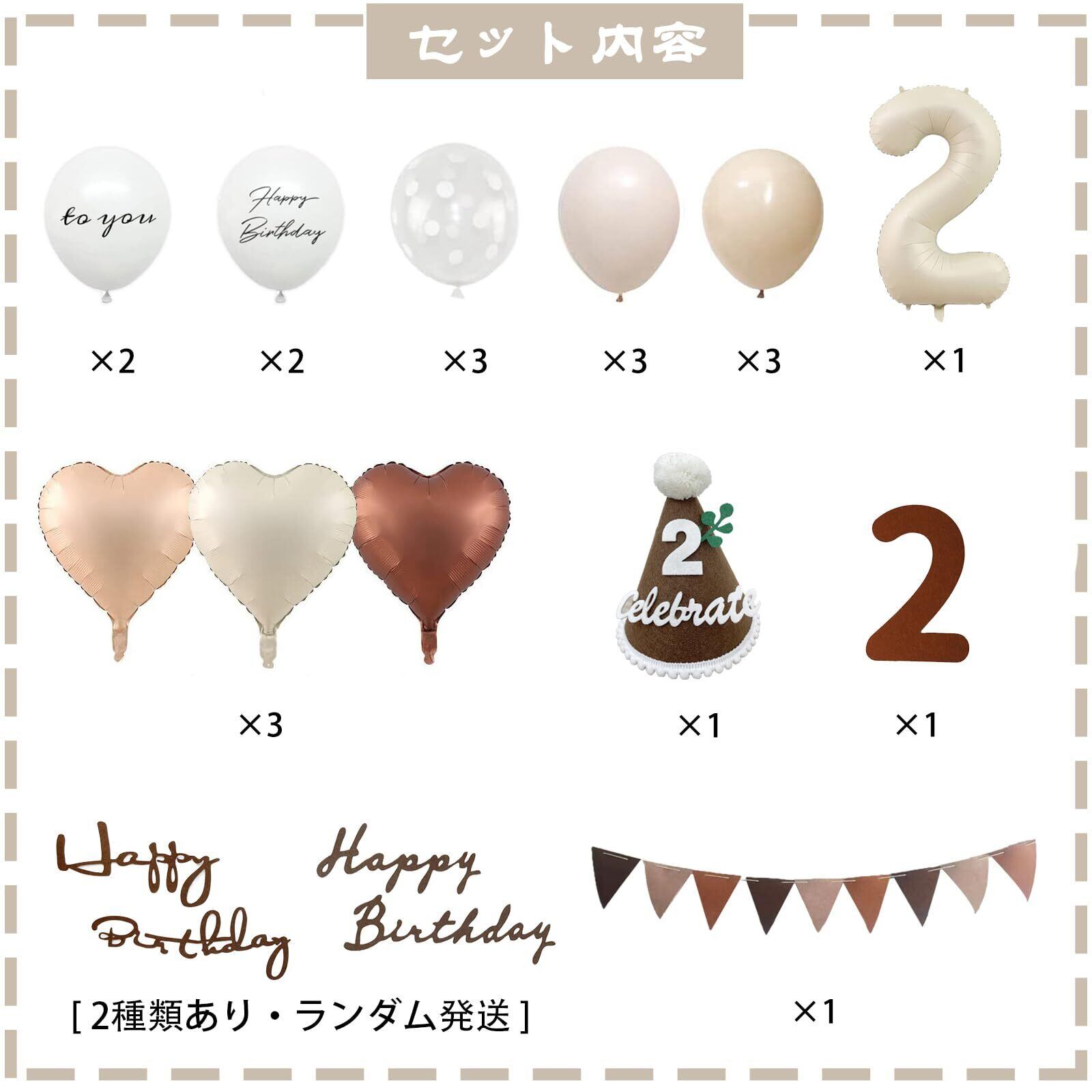 【セット内容】①ゴム風船×13(Happy Birthday × 2、TO YOU × 2、グレージュ× 3、肌色× 3、クリアドット× 3) ②ハートバルーン×3(クリーム色×1、肌色×1、チョコレート色×1) ③数字バルーン×1 ④三角帽子×1 ⑤フェルトの三角旗ガーランド×1 ⑥フェルト数字 ⑦フェルトアルファベット(2種類あり・ランダム発送) ⑧両面テープ