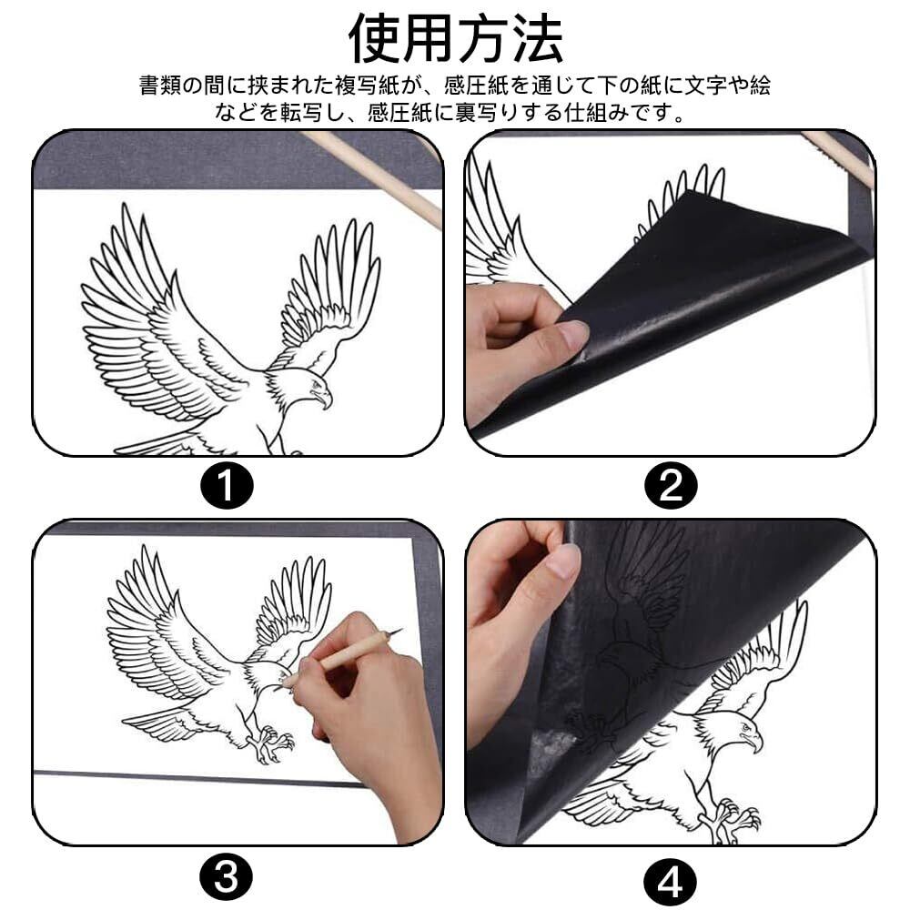 【使用方法】複写紙を書類の間に挟み、ボールスタイラスが感圧紙を通じて下の紙に伝わり、感圧紙が裏写りします。