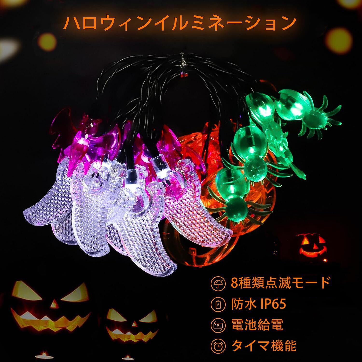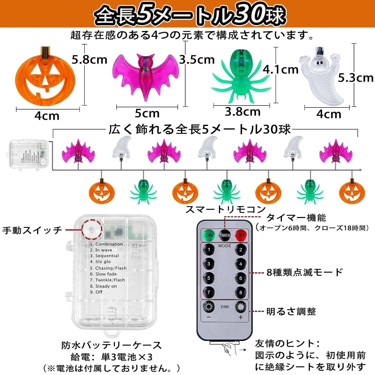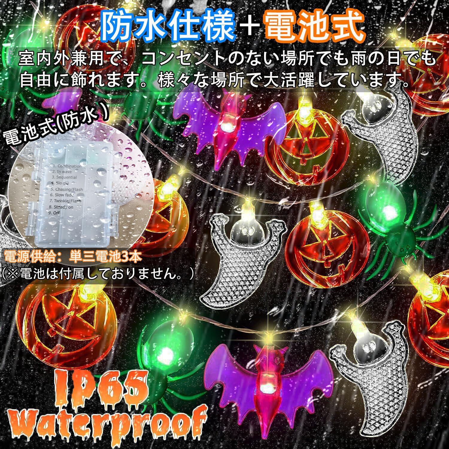 ハロウィン 飾り カボチャ ライト 【30球全長5M 電池式 点灯パターン8種類】 ハロウィン 防水 LED かぼちゃ イルミネーション 装飾 Halloween 飾り付け パンプキン お化け コウモリ 吊り下げ ストリングライト (色2)