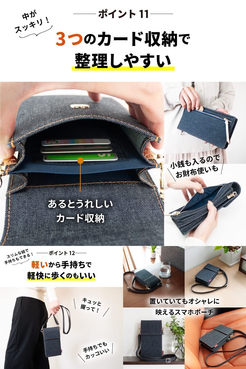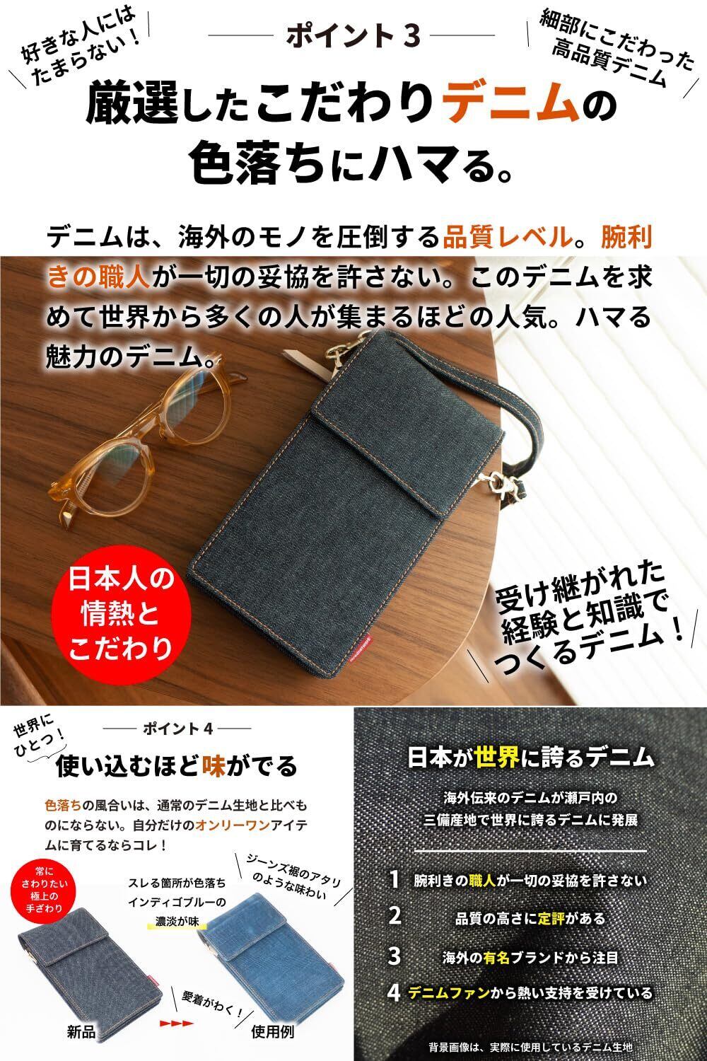 【デニム好きには、たまらない】あなただけの色落ちを楽しむ。スマホポーチバッグからスマホを探すストレスから解消▶︎両手フリーの必須アイテム。スマホと最小限でお出かけにいいサイズ ▶︎結構入ります。世界でも名高い日本製デニムから厳選したデニム生地を使用したスマホポーチ ▶︎この高品質なデニム生地は、海外のモノを圧倒する品質レベル。腕利きの職人が一切の妥協を許さない使い込むほど味が出る ▶︎色落ちの風合いは、一般的なデニム生地と比べものにならない。自分だけのオンリーワンに育てるならコレ。伸び縮みのマチが持ち物によって調整 ▶︎収納するものに合わせる。軽快に動くときの斜めがけに最適▶︎ ウォーキングに最適。小物の収納に便利なファスナー収納▶︎ スマホと別で傷からガード。マグネットホックで開け閉め楽チン▶︎ フタありで中身の飛び出しも安心。最小限のモノを持ち歩くちょうどいいサイズ感 ▶︎ポケットに入れるとかさばる時に大活躍。サイズ、横 約10.5cm 縦 約19cm 厚さ 約2.5cm ■重量、約155g(肩掛け紐含む)