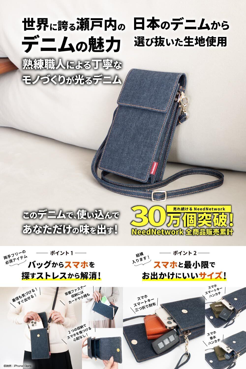 [ニードネットワーク] スマホポーチ レディース 日本が誇るデニム お財布ポシェット 斜めがけ スマホショルダー インディゴブルー