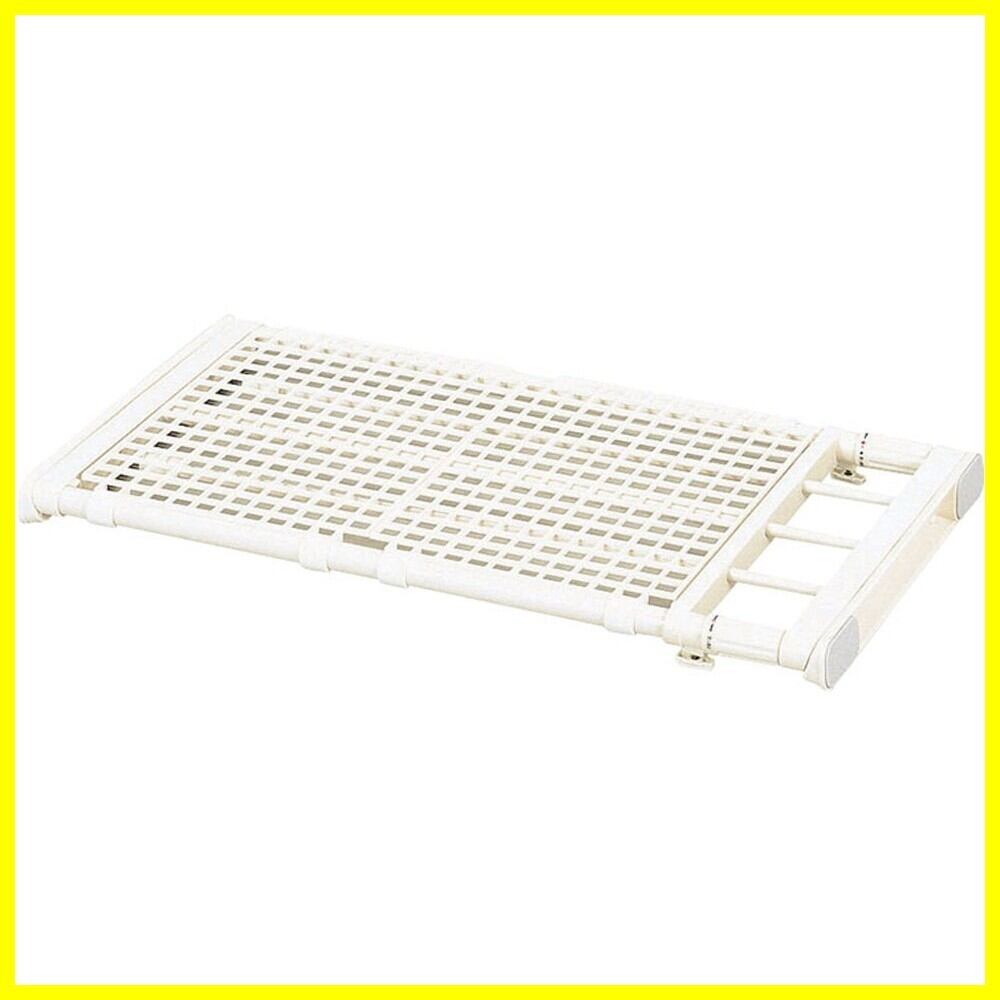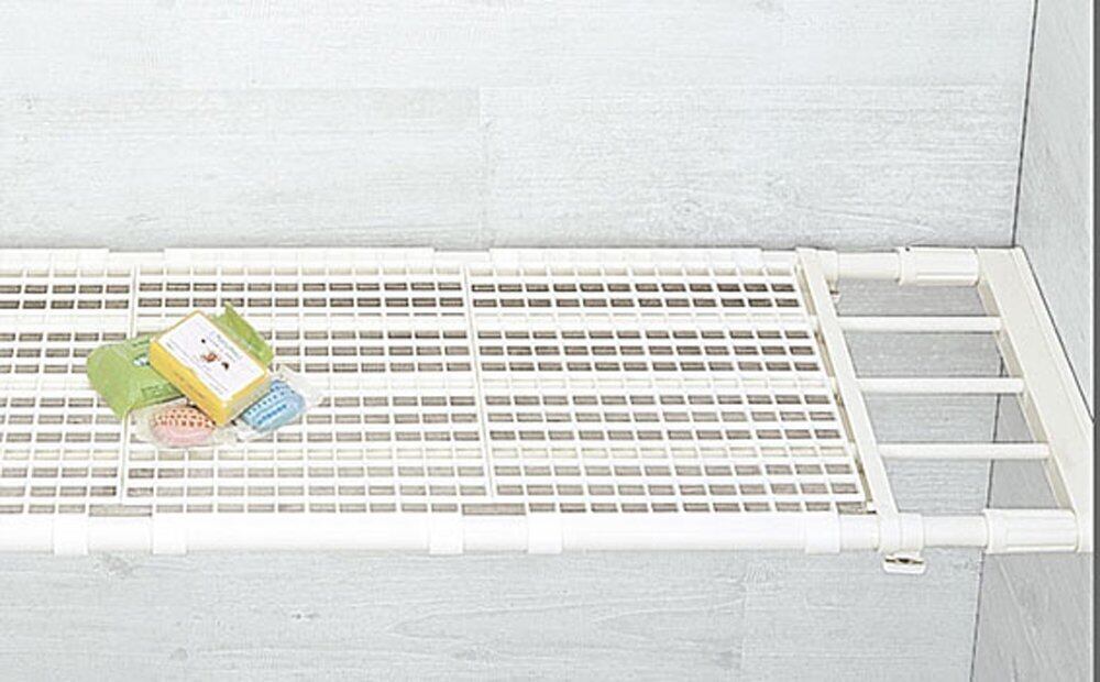 サイズ(約):68×35.5×H5cm、取り付け寸法:68~104cm、重量:1.5kg、最高耐荷重:55kg、材質:パイプ=スチール(PP樹脂被覆)、メッシュ棚=ポリプロピレン、その他=ABS樹脂、EVA樹脂、ポリエチレン、生産国:中国