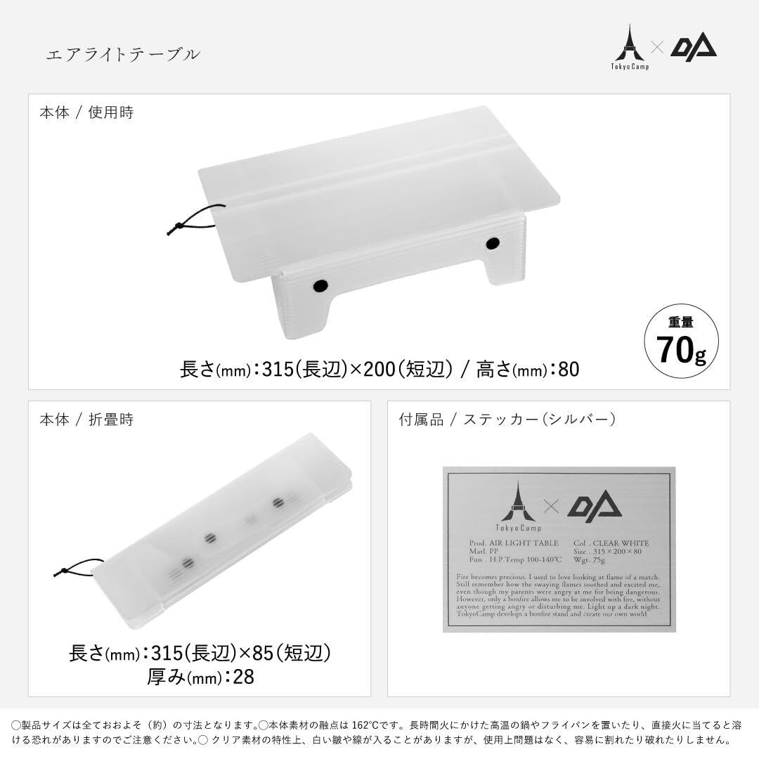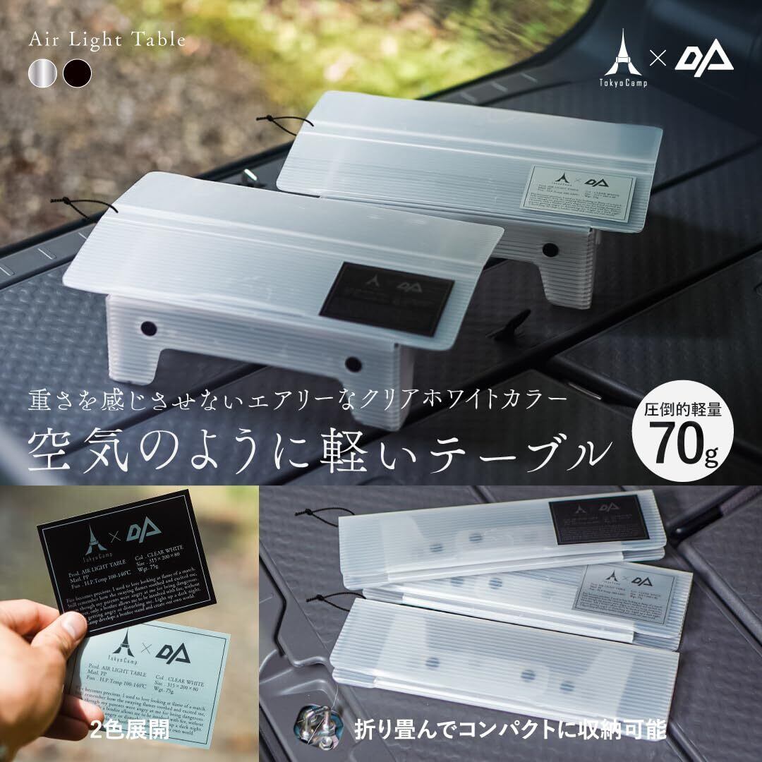 【エアライトテーブル】 TokyoCamp×OPTIONコラボ商品! OPTIONとは、キャンプギアに「選択」を与え、新たな価値を生み出すこと。韓国発のキャンプスタイルを提案するブランドとのコラボ商品の登場です。 超軽量!コンパクト。ソロキャンプ、ハイカー、バックパッカーのためのソロテーブル 重さを感じさせないエアリーなクリアホワイトカラーでどこへでも連れ出せる相棒と一緒に今日はどこへ行こうか。