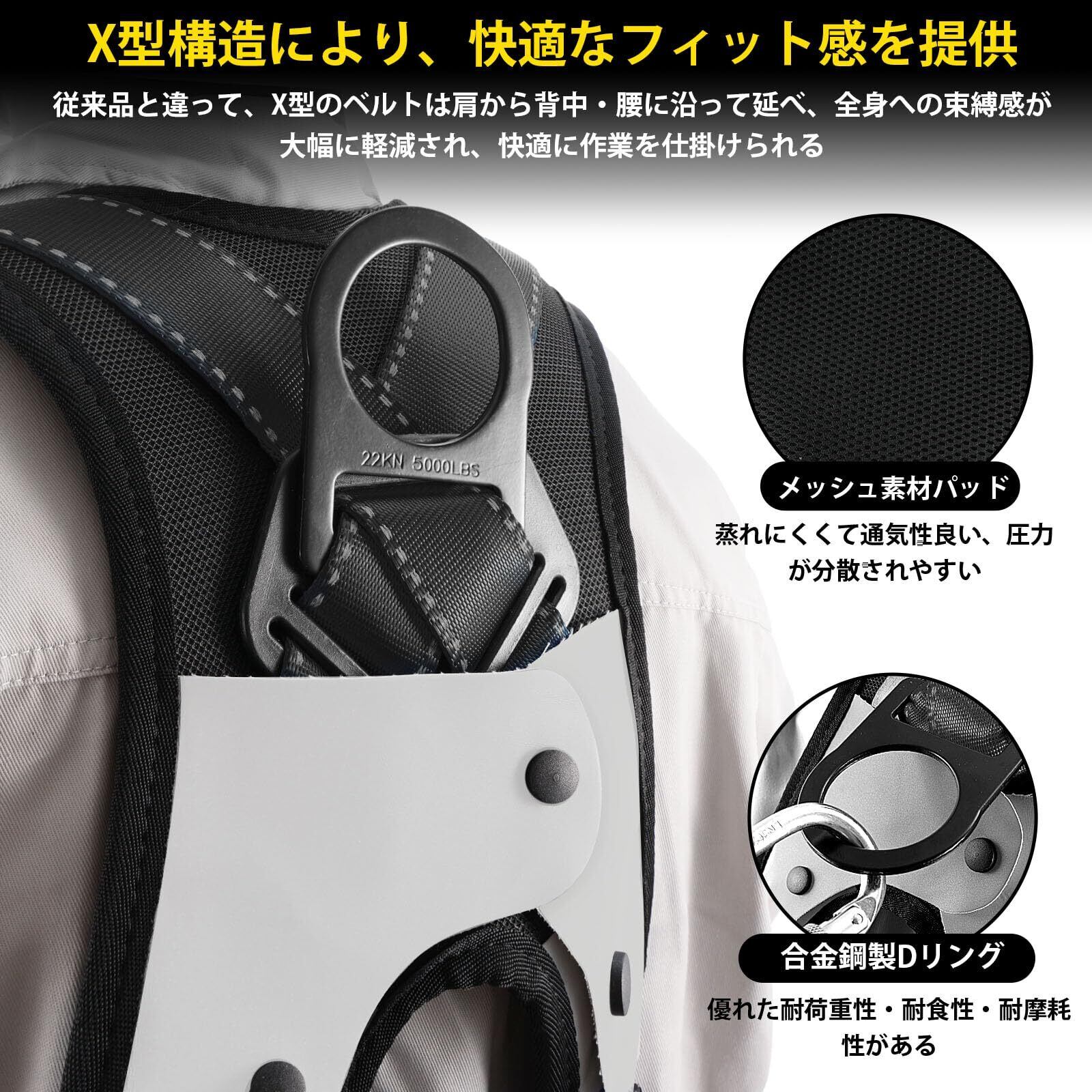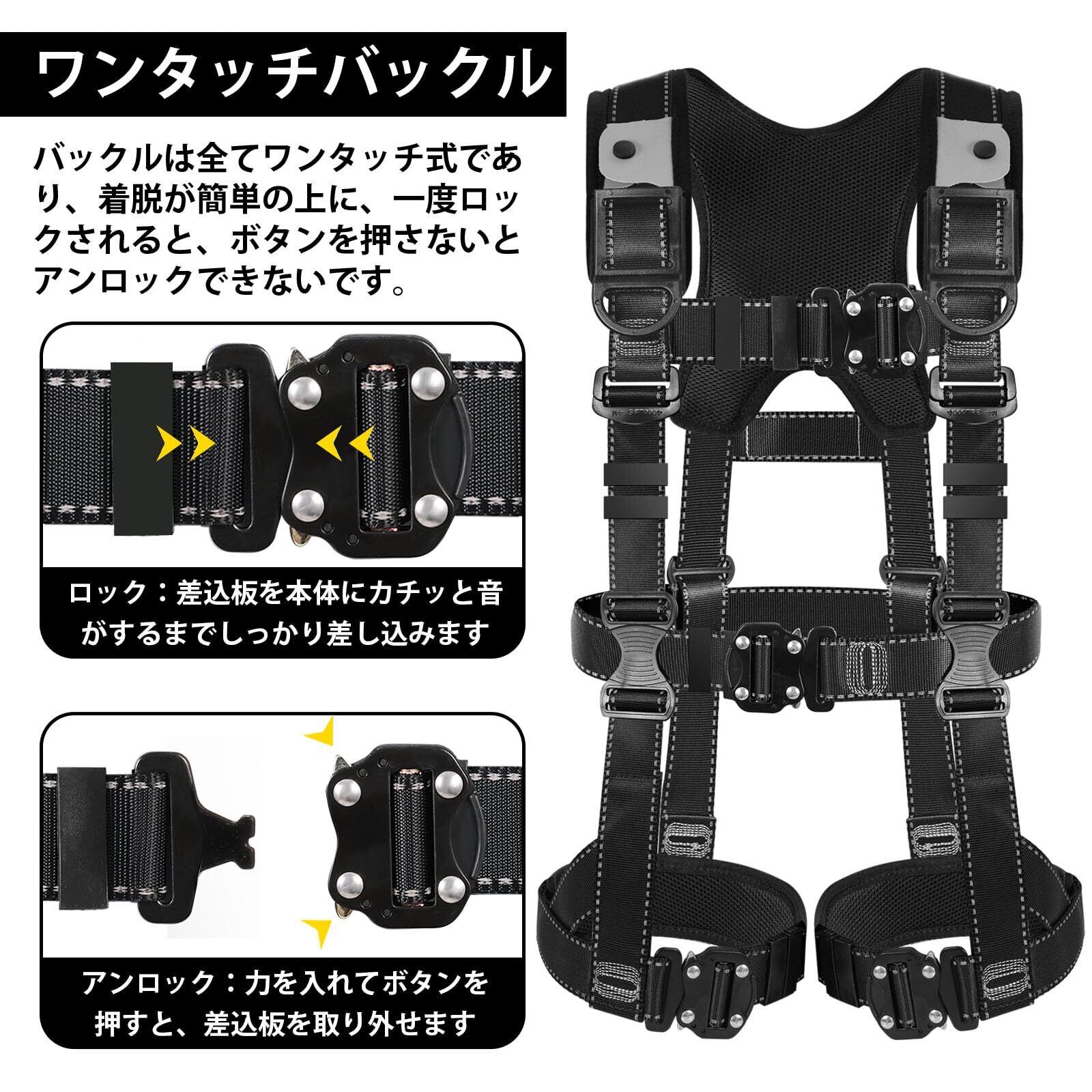 【脱着便利快適】:X型肩パッド付きで肩への負担を軽減して長時間着用するのに不便ではありません。パッドは通気性良くて蒸れにくいメッシュ素材を採用し、効果的に肩への荷重をX形に沿って背中に分散します。腿ベルトも同様にパッドを取り付けていて、着用するときの締め付け感を低減し、快適な着用感を実現しました。また、ハーネス安全帯はすべてワンタッチ式のバックルを用いています。合金製であるため、耐腐食性や耐荷重性や耐摩耗性などに優れています。ワンタッチバックルでは一応ロックされると、レバーを押さないと手軽にアンロックできない心丈夫なパトナーです。ワンタッチするだけで着用と脱ぐのがより簡単になります。