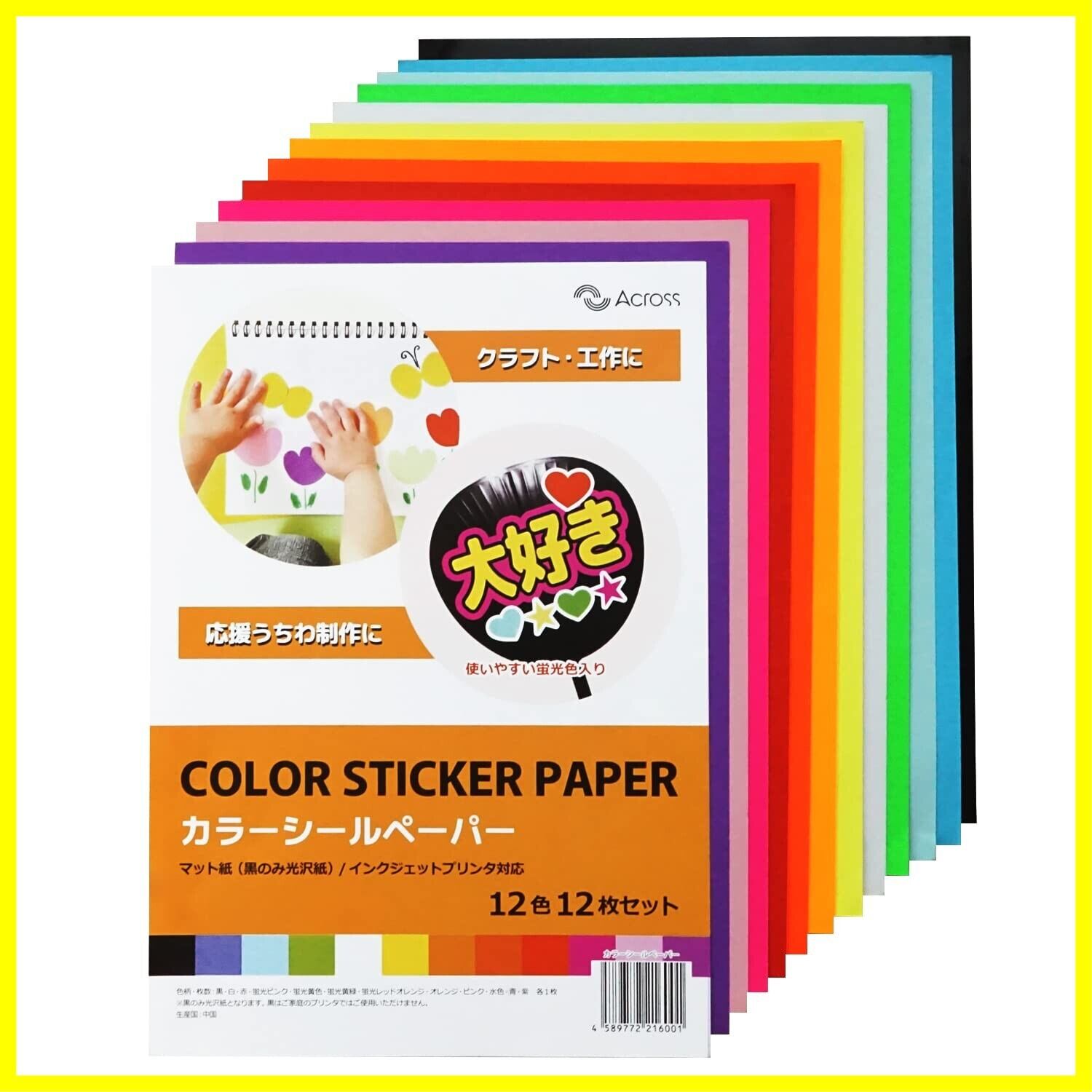 Across カラーシールペーパー 蛍光 12色 12枚セット A4 うちわ 応援うちわ シール カッティング シート カラフル 工作 (カラーシールペーパー)