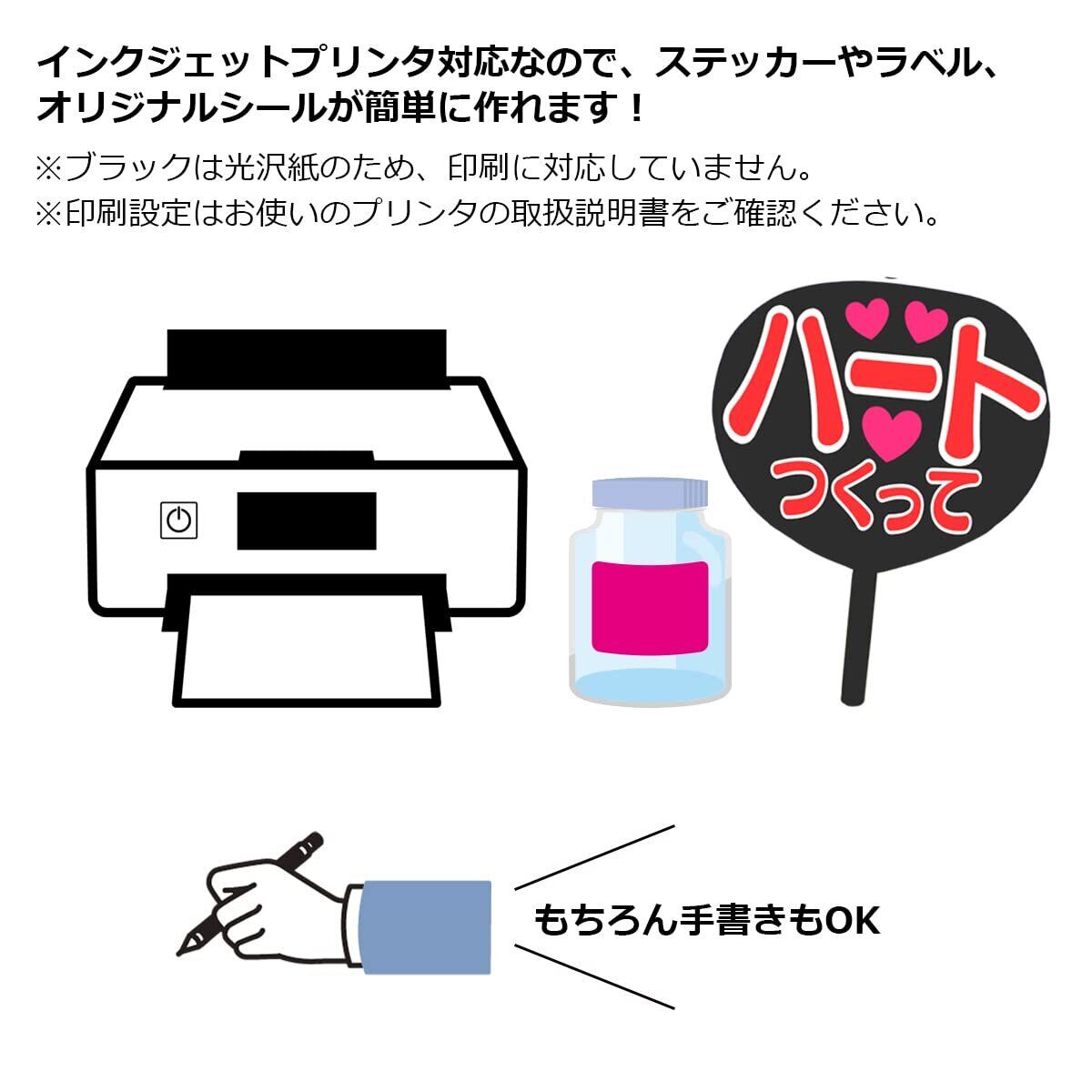 【インクジェットプリンター対応】 手書きはもちろん、インクジェットプリンター対応なので、切り取り線を印刷すれば、ラベルや切文字等の制作が簡単にできます。 ※ブラックは光沢紙のため、印刷に対応していません。
