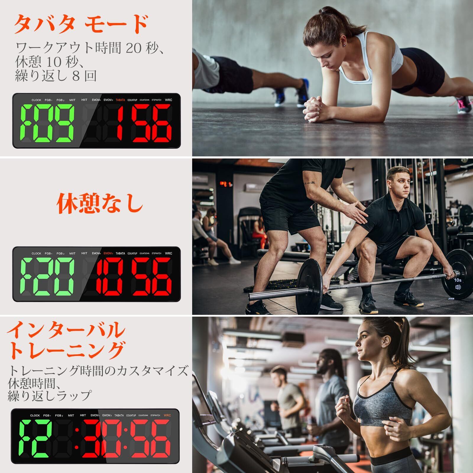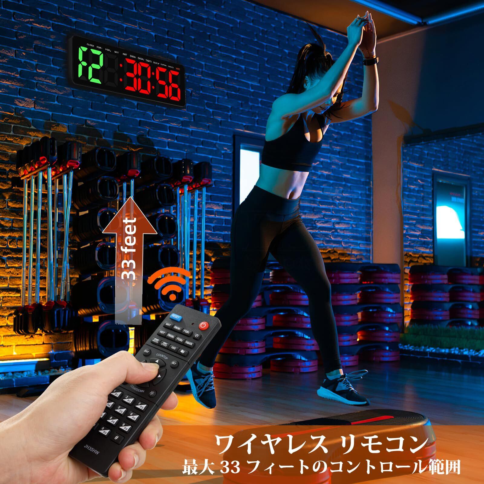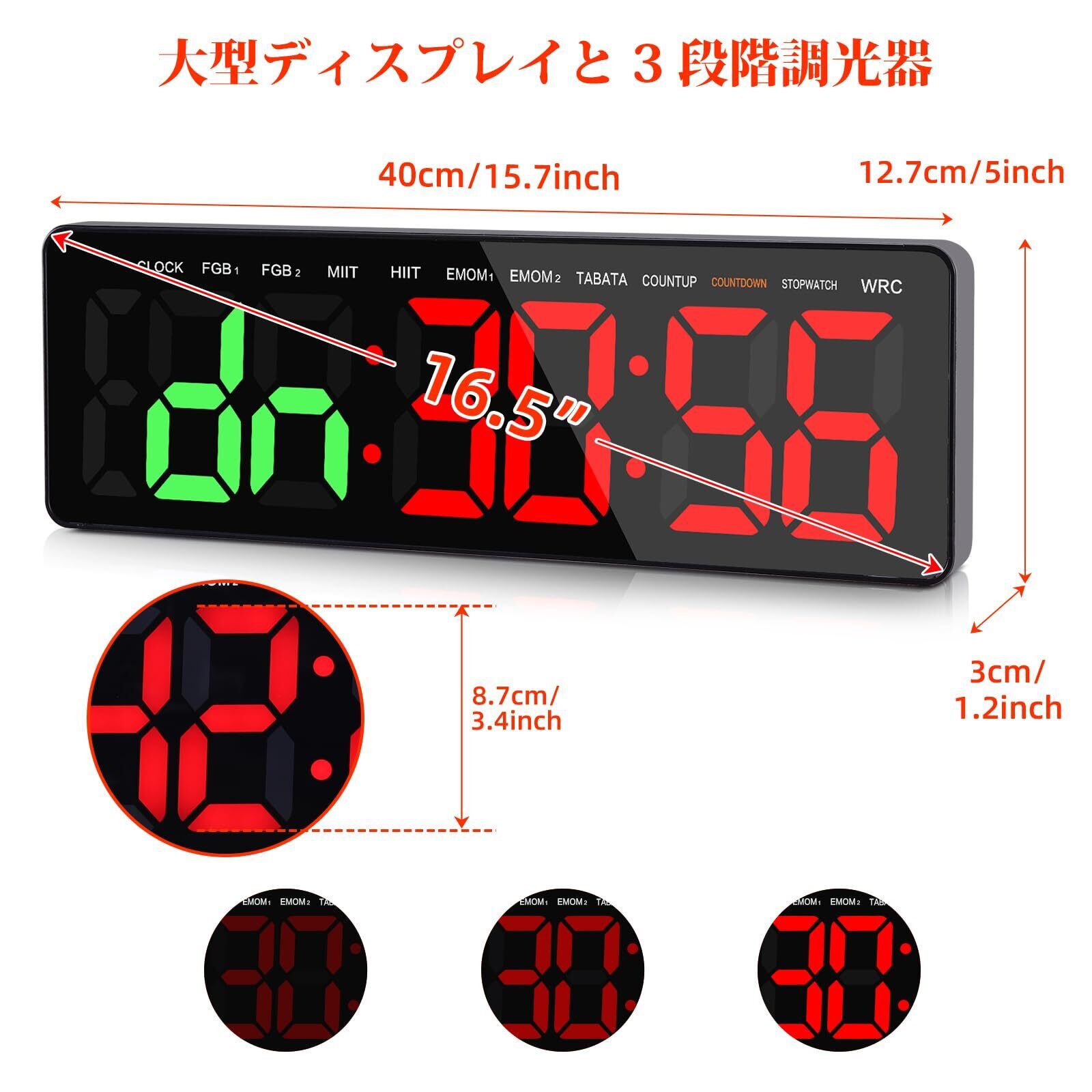 多機能タイマー:16.5インチ大型LEDタイマー、本体は長さ40cm * 幅12.7cm、8.7cm/3.4インチの大きなフォントで、ジム、会議室、または自宅でも読みやすくなっています。壁掛けデジタル時計としてショッピングモールやスーパーマーケットにも設置できます。