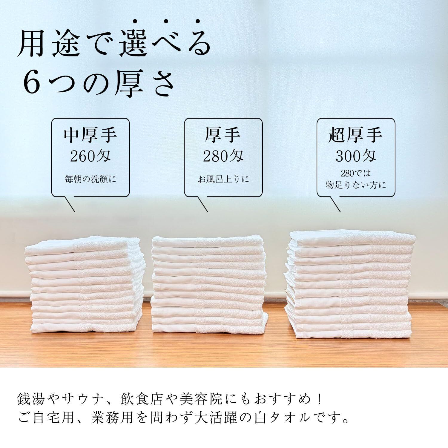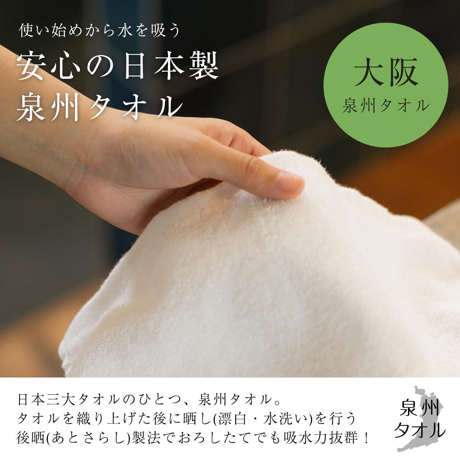 【商品サイズ・重さ(1枚当たり)】<200匁>34×85cm 約62.5g <220匁>34×86cm 約68.5g、<240匁>34×88cm 約75g <260匁>34×94cm 約81g <280匁>34×100cm 約90g <300匁>34×100cm 約96g 【カラー】白 【素材】綿100% 【生産地】日本(泉州)