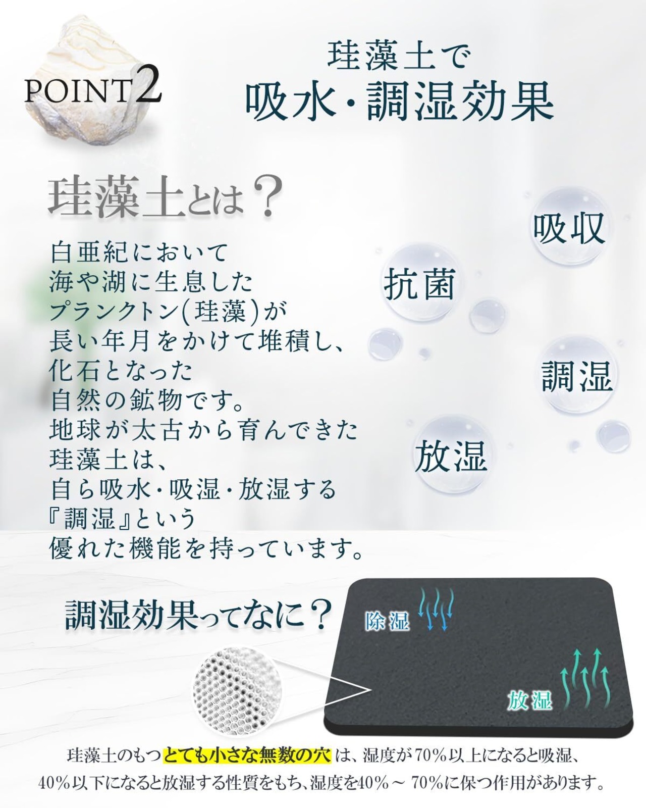 【珪藻土配合】吸水・吸湿・放湿する『調湿』という優れた機能を持っています。 珪藻土は、植物性プランクトンの化石を原料としており、無数の小さな穴があります。 これによって、高い吸水性と速乾性を兼ね備えています。