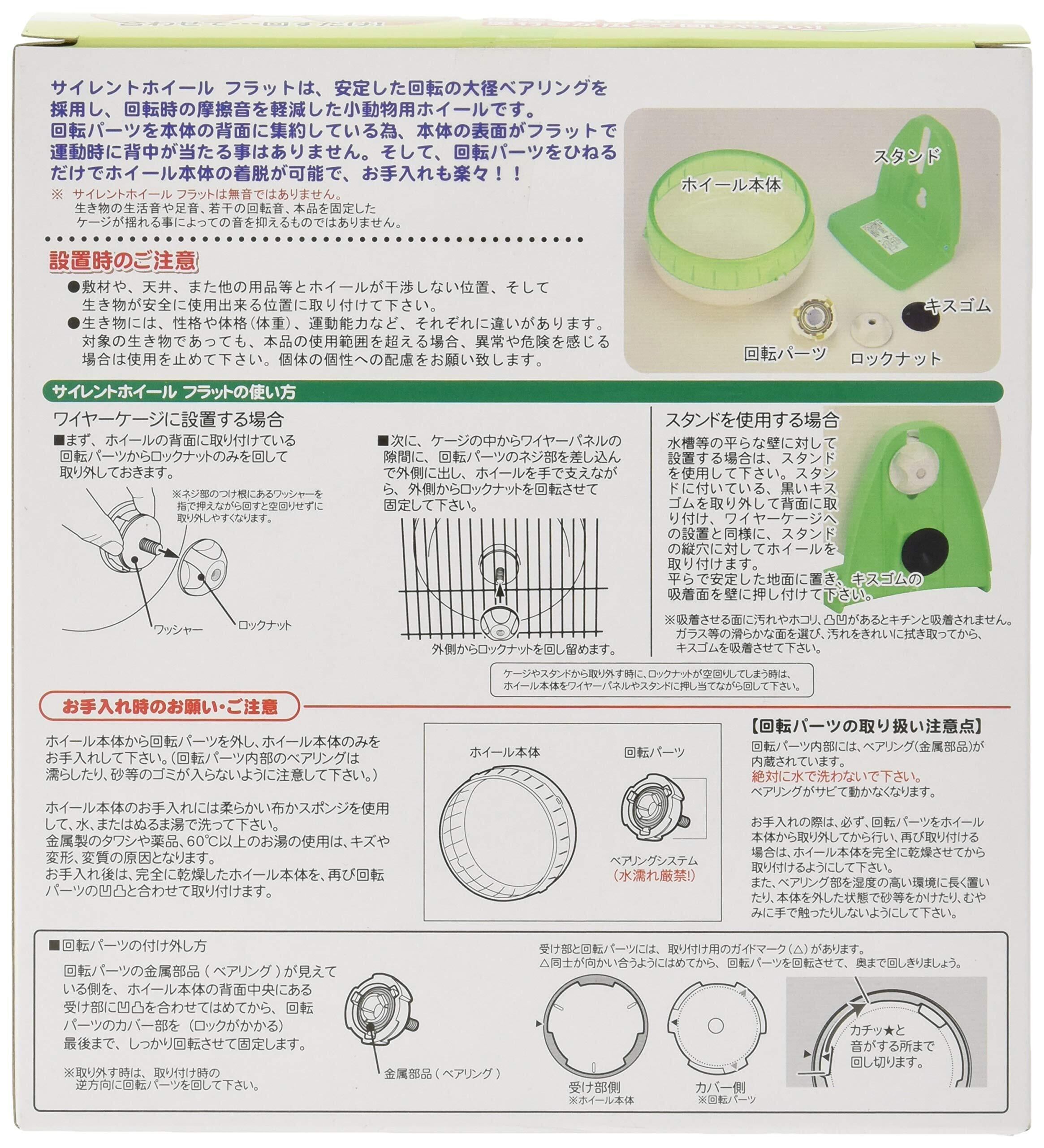 ●本品はハムスター等の小動物用運動器具(回し車)です。 ●他の目的及び他の生き物には使用しないで下さい。 ●本品の取り扱いは丁寧に行って下さい。投げたり、転がしたりしないで下さい。 ●火気には絶対近づけないで下さい。 ●直射日光の当たる所、高温・高湿度になる場所には置かないで下さい。 ●幼児が本品で遊んだりしない様、注意して下さい。 ●部品の分解や改造をしないで下さい。 ●必ず、キスゴムが吸着できる壁面やケージワイヤーに取り付けて使用して下さい。置いただけの状態では、ホイールが転倒する場合があります。 ●使用している間に、固定部(回転パーツ、ロックナット)等がゆるんでくる場合がありますので、使用状況を見ながら、時々確認を行って下さい。 ●複数の生き物が居る場所(多頭飼い等)では使用しないようにして下さい。 ●回転パーツには、金属部品(ベアリング)を使用していますので、水で洗わないで下さい。金属部品(ベアリング)が濡れると、サビが発生して、回りが悪くなったり雑音が出る場合があります。 ●ベアリングの構造上、ホイールのブレに若干のバラつきがありますが、ご了承下さい。 ●サイレントホイールフラットは無音ではありません。(従来のホイールに比べて回転時に発生する音が静かなホイールです。) ●生き物の生活音や若干の回転音、また、本品をケージに固定する場合にケージ部分が揺れる事によって発する音に関しましては、ご容赦いただきますようお願いいたします。 ※生き物は、種類や性格、体格(体重やサイズ、成長など)により、個体差があります。飼育者の方は生き物の行動や習性をよく理解・観察して本品の使用範囲を超える場合や、異常や危険を感じた場合は、直ちに使用を中止して下さい。 ※飼育用品は、100%安全な環境を提供できるものではありません。生き物は、成長によって大きさが変化したり、各個体によって性格も異なります。また、四季を通して、様々に取り巻く環境も変化します。大切なペットの安全な飼育環境を常に保てるようにしてあげましょう。 ※飼育時における事故等に関しましては、責任を負いかねますので予めご了承下さい。 ※製品の仕様、価格等は予告なく変更する場合があります。