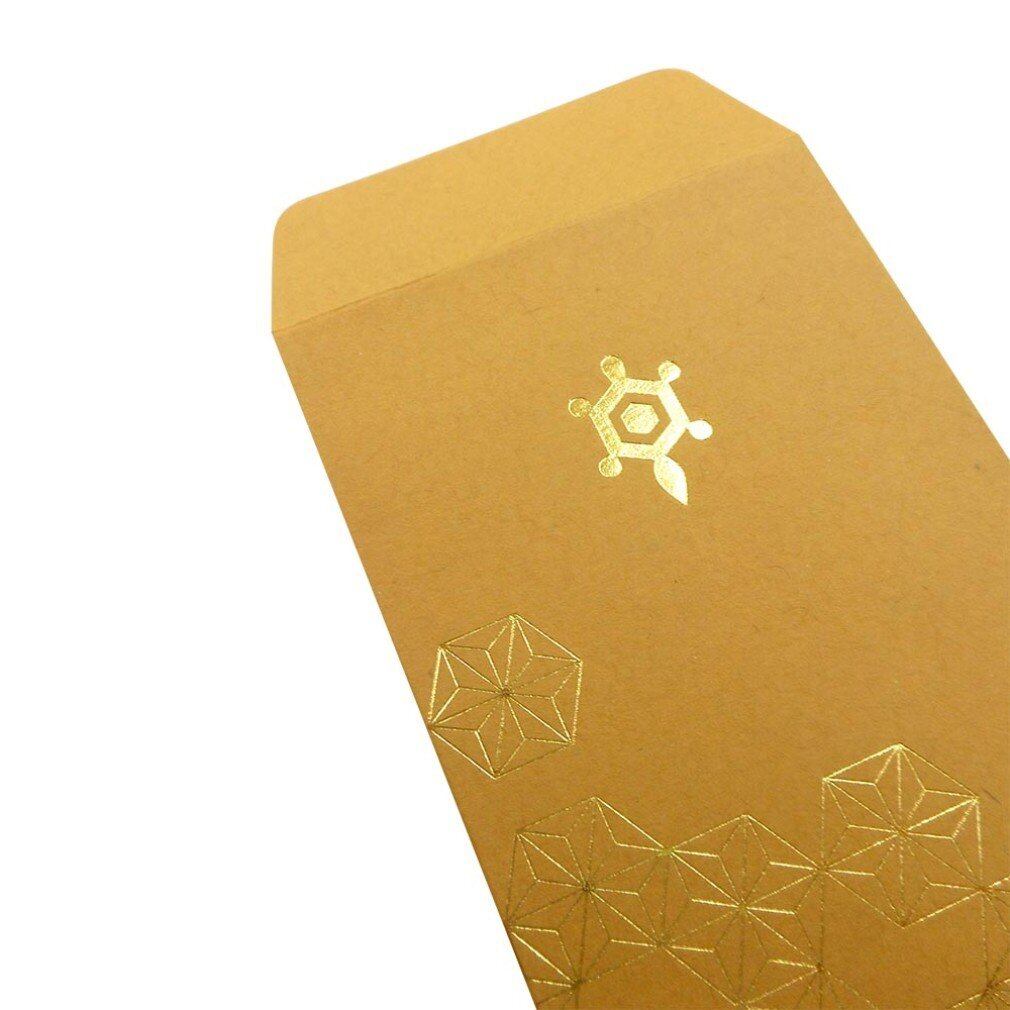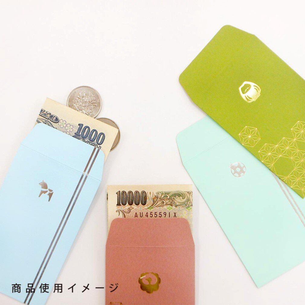 カラークラフト紙を使用。ワンポイントで亀が箔押しされている。落ち着いた色合いが特徴の、和風のポチ袋。