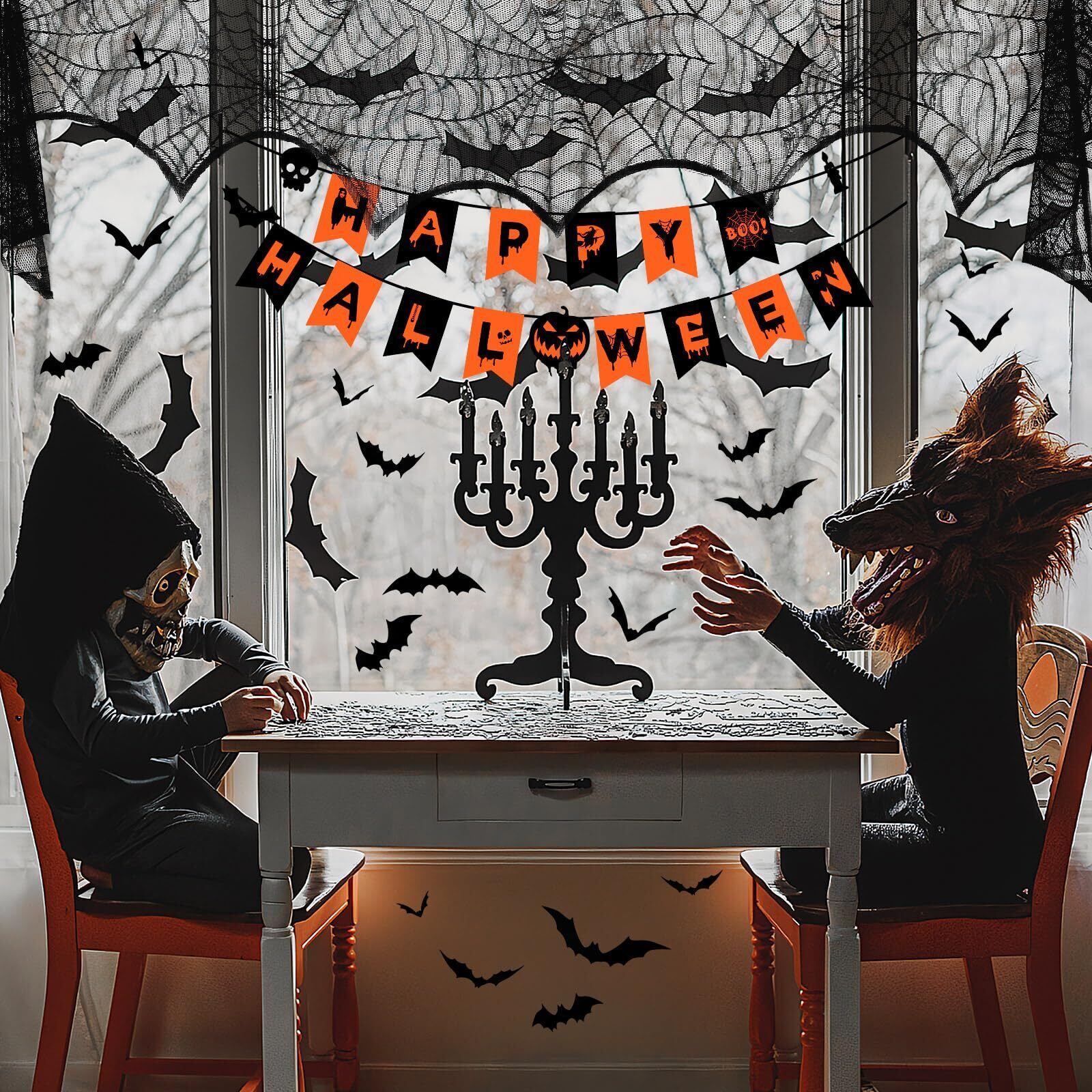 【豊富な内容】パッケージには1枚のハロウィン テーブルクロス、1枚のハロウィン テーブルランナー、1枚のカーテン、1個のハロウィン ガーランド、60枚のハロウィン コウモリ ステッカー があります。セット内容が豊富なので、自宅用のハロウィン 飾りにじゅうぶんです。