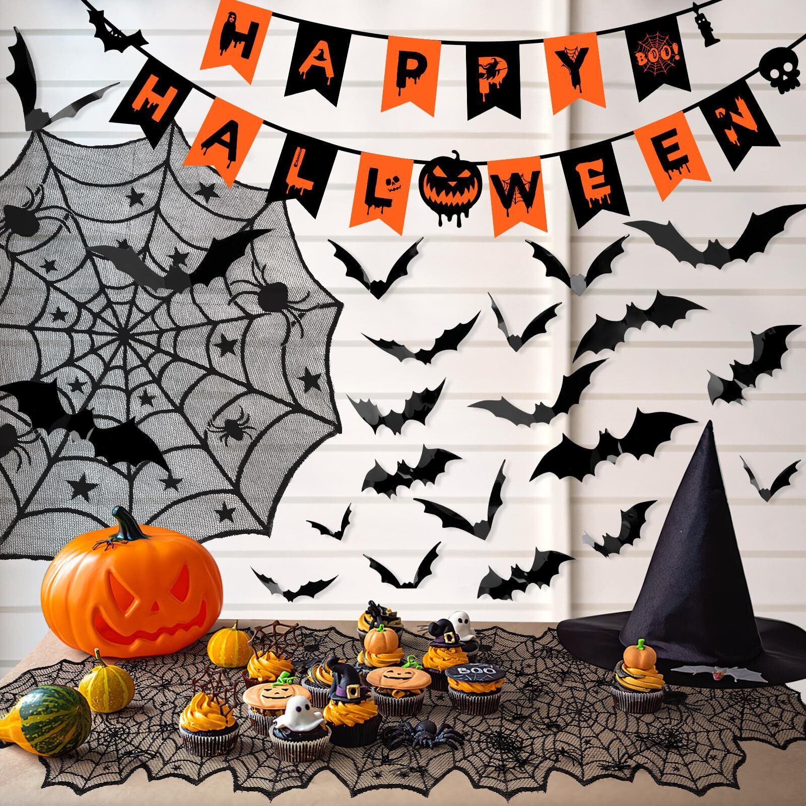 METBOU ハロウィン テーブルクロス 64点セット ハロウィン 飾り テーブルランナー 蜘蛛の巣 ハロウィン 装飾 ガーランド コウモリ ステッカー ハロウィンパーティー デコレーション