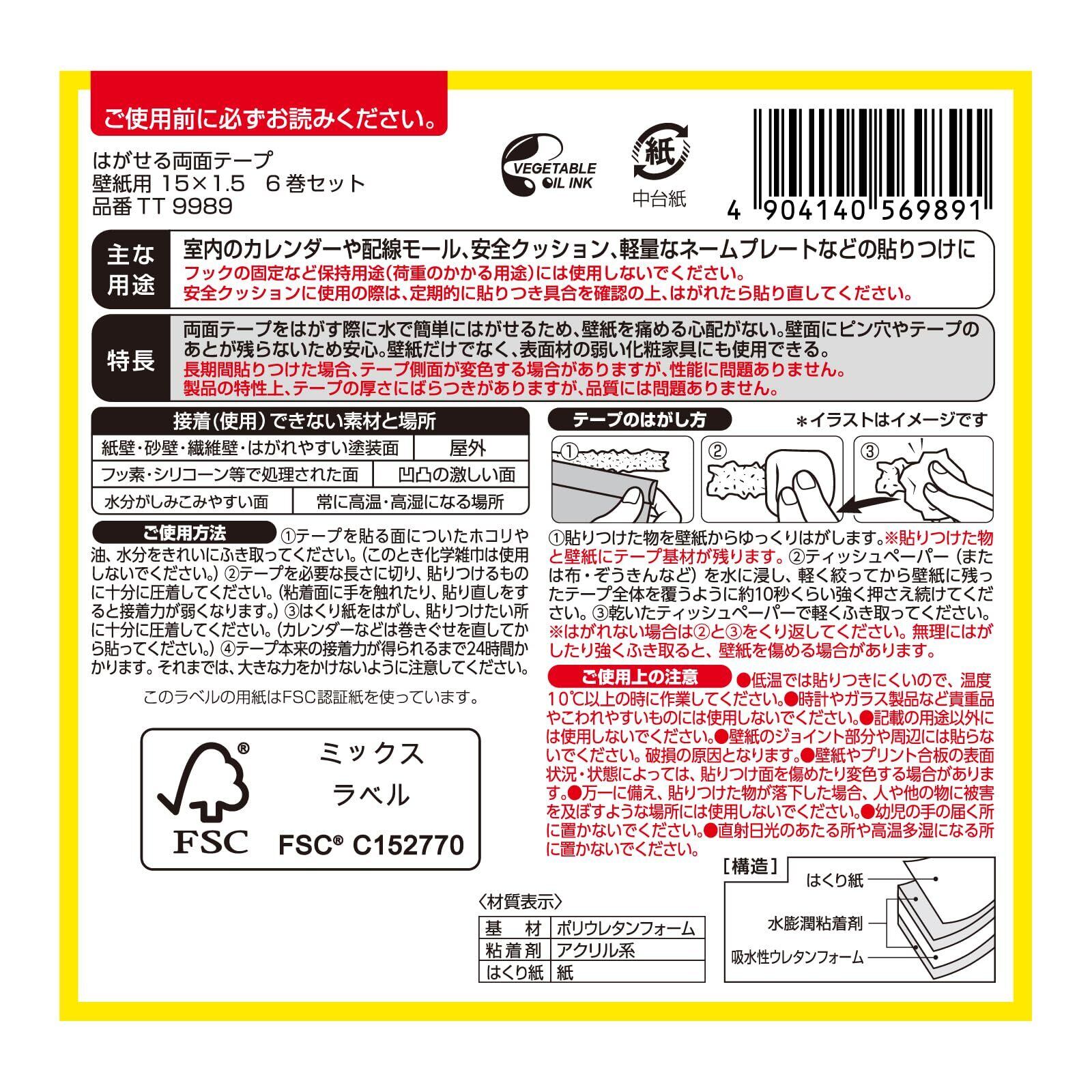 ニトムズ(Nitoms) ミズトレック 壁紙用両面テープ 水できれいにはがせる 簡単施工 のり残りなし 室内用 幅15mm×長さ1.5m 6巻入 TT9989