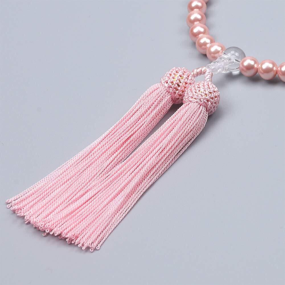 主玉:ピンク貝パール8mm、天玉:本水晶6mm 親玉:本水晶10mm 頭付房(ピンク)