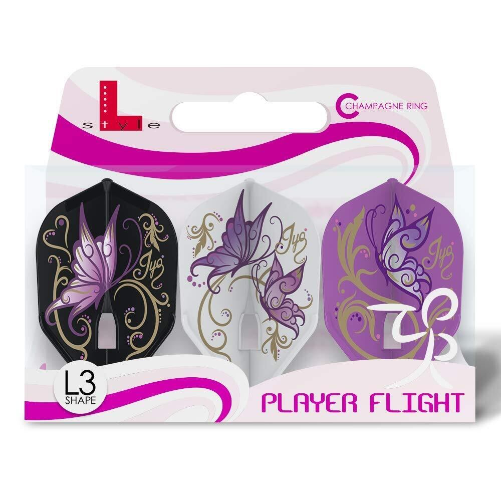 ■スペック 仕様:L-Flight PRO 形状:L3 シェイプ カラー:ミックス セット数:3個 ■商品説明 PERFECTで活躍中のL-styleプレイヤー 松本 伊代選手のシグネイチャーフライト第4弾 ■選手コメント ・フライトデザインのこだわり 自分のモチーフを蝶でずっとやってきて双子の母になったので蝶を2匹にバージョンアップして頂きました。 ・試合に対する意気込み プロになって10年経ちます。勝つ事はもちろんですが今でも応援してくださる方への恩返し、そして試合に出させてもらえてる家族への感謝の気持ちを噛みしめながら試合に挑んでいます。 ・現在のセッティング Lフライト シェイプ(IYOフライト) Lシャフト ロックスリム クリア300 プレミアムリップポイント ブラック ■L-Flightの特徴 1.中央の星型で常に90度を維持 ダーツの安定した飛びをアシスト。 2.一体型成型 とても軽くて丈夫で通常フライトよりも長くご愛用いただけます。 3.シャフトにスムーズ挿入 先端の特殊加工によりフライト挿入時のストレスがゼロに。 4.後部のフライトガードが一体化 フィルム加工がないため、フィルムのはがれによる無得点も防ぐ。