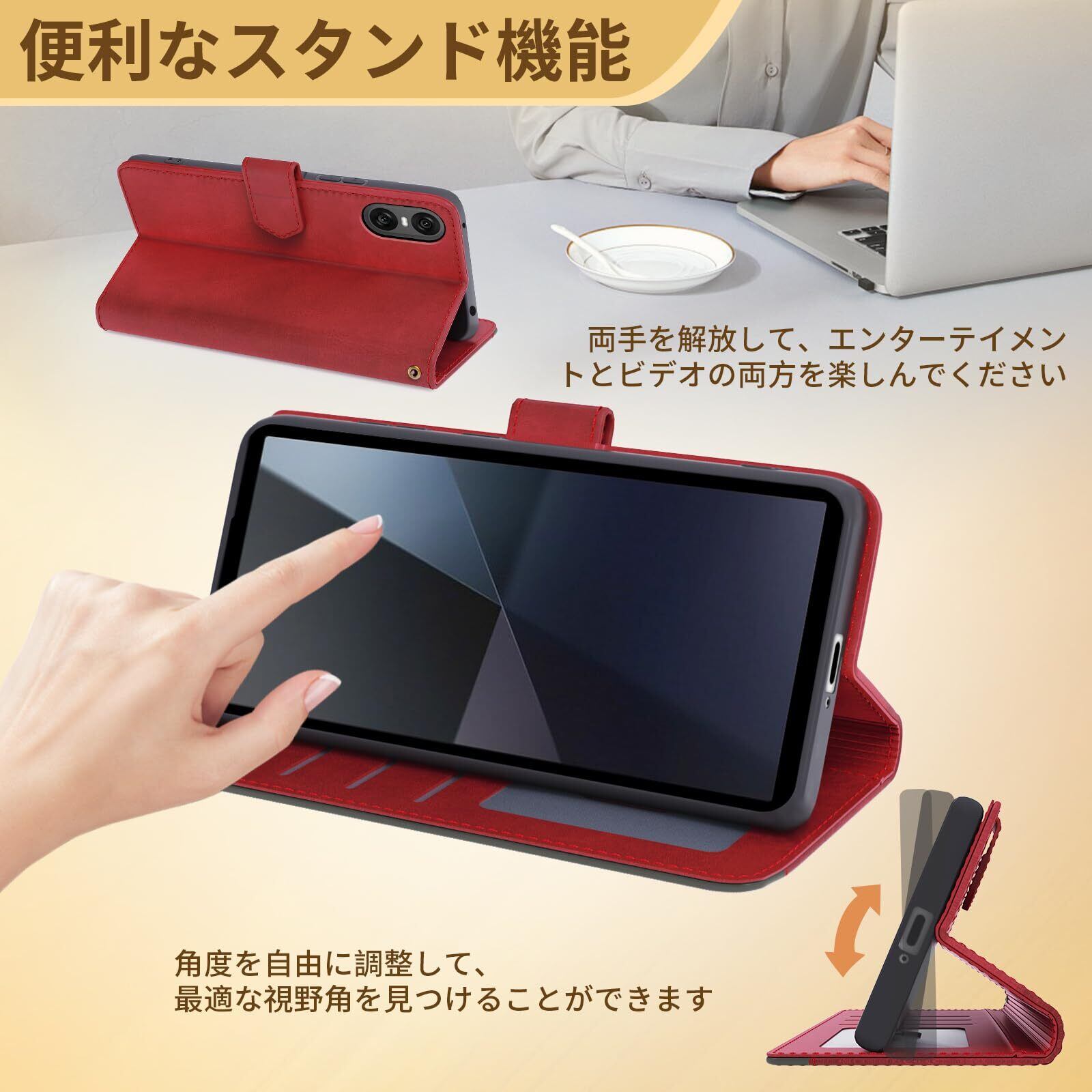 【横置きスタンド機能】背面の折りたたみ式スタンドにより、スマートフォンを横置きで立てかけ、最適な角度で動画視聴やビデオ通話を楽しむことができます。角度調整は自由で、会議中やレシピの確認、音楽や楽器の練習にも役立ちます。画面が自動で滑り落ちることなく、しっかりと安定するので、安心して使用できます。手が離せない時でも、快適に視聴や操作ができるため。手持ちでは疲れやすい長時間の視聴も快適にサポート。生活の利便性を大きく向上させます。