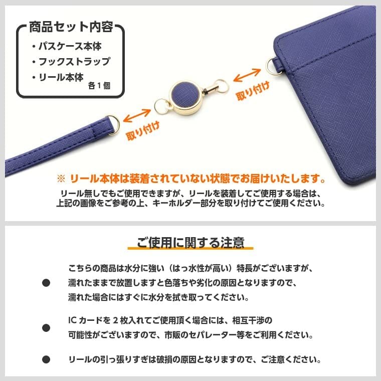 リールは最大約36cmまで伸縮が可能。リールとスラップには、パスケース本体と同じカラーの生地を使用しています。(リールの本体は各カラー共通でゴールドカラーとなります。)