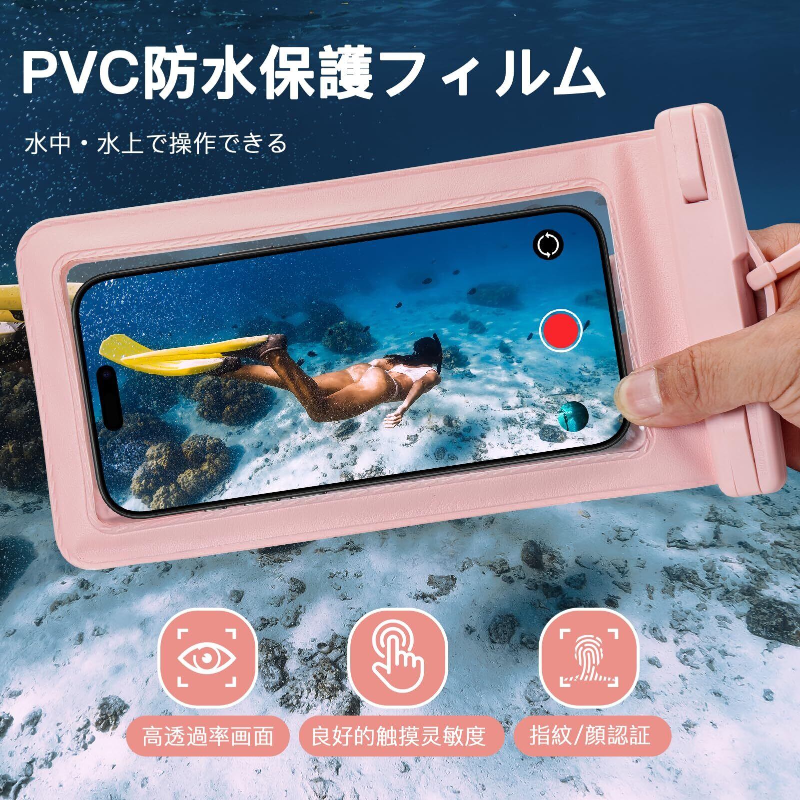 【指紋/顔認証タッチ快適】透明なPVC素材防水保護フィルムを採用し、耐久性と柔軟性がある、および高透過率と快適な感触、顔認証できると同時に、指紋認証もでき、水中で自由に撮影して記念写真を撮ることもできる。