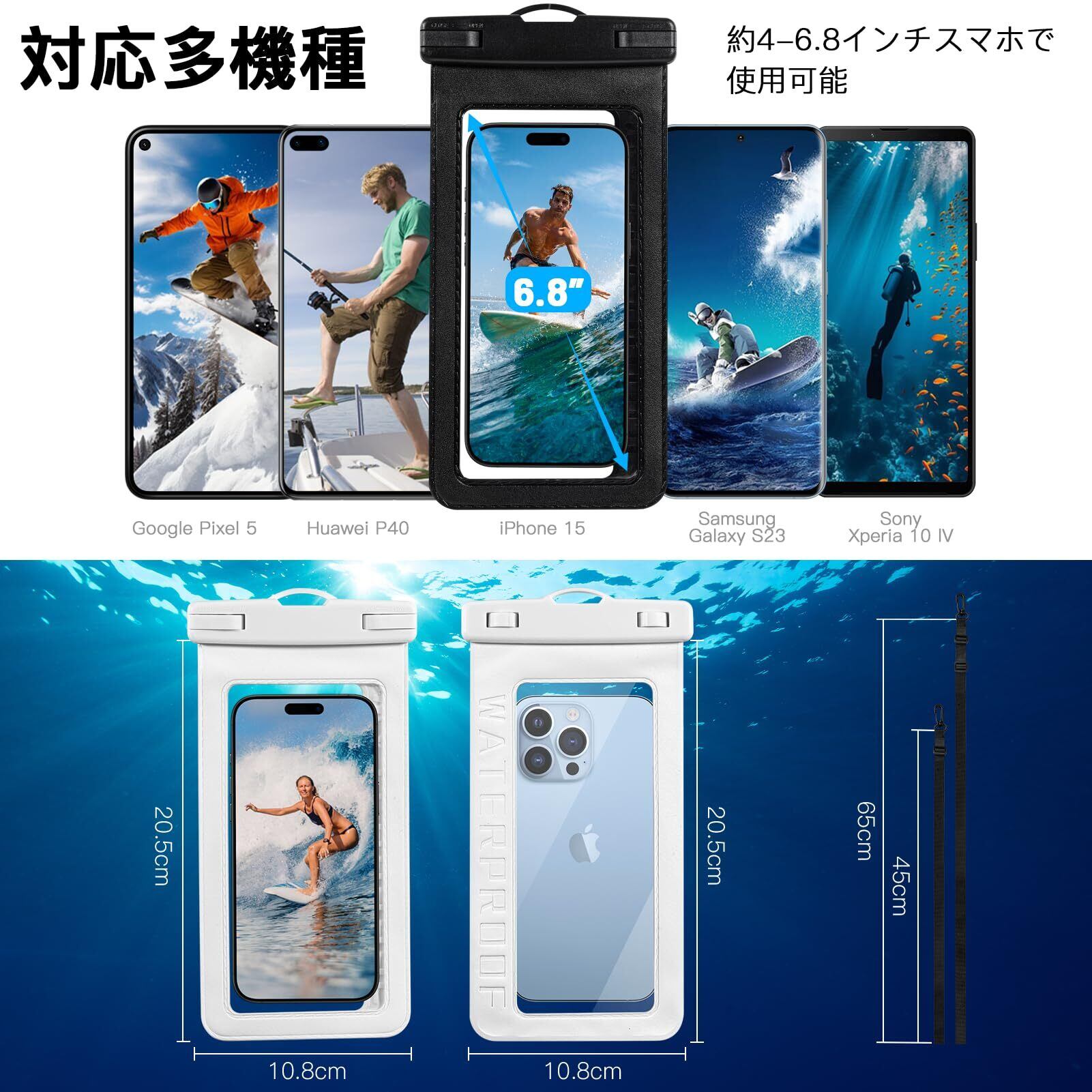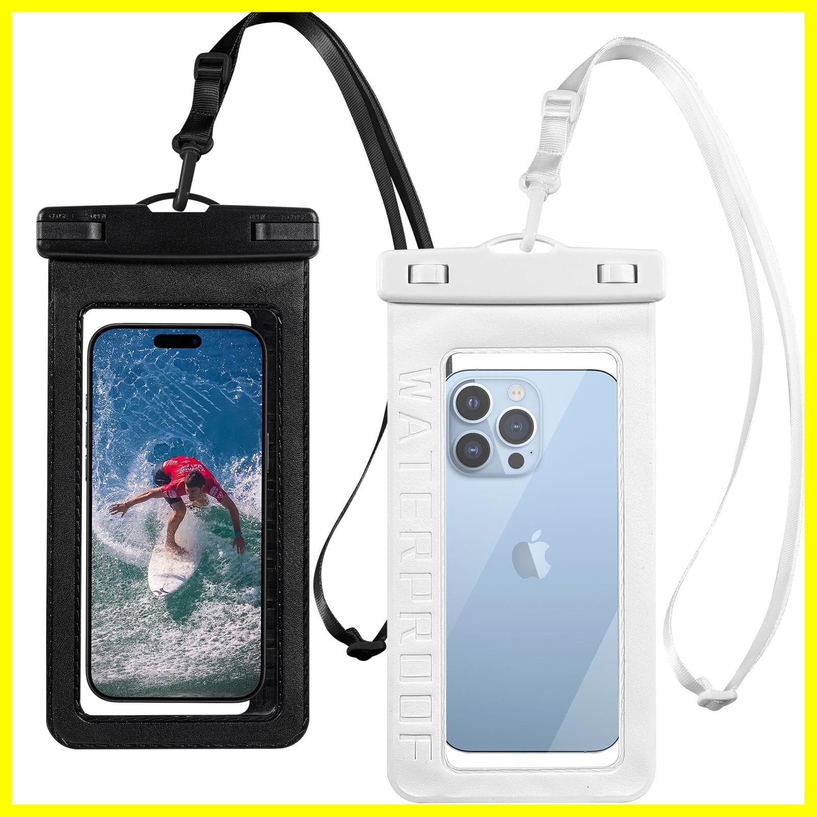 Firrazle スマホ 防水バッグ【2枚セット 完全防水】IPX8認定 指紋認証/顔認証 スマホ保護 タッチ操作 水中撮影 高透過率 7インチ以下全機種対応 調整可能長さ 海 水泳 プール 風呂 スキー サーフィン ウォーターパーク 海釣り 潜水 温泉適用 (黒&白)