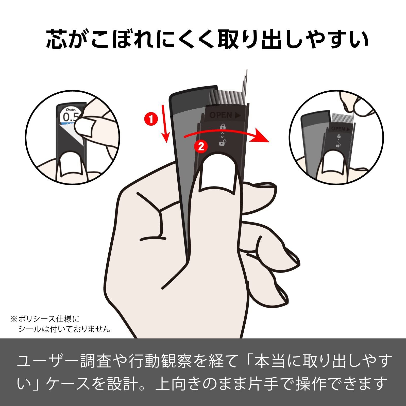 調査や行動観察を繰り返して完成させた操作性の高いケース構造。ケースを上向きのまま片手で操作できるから、芯をこぼすリスクを減らせます。