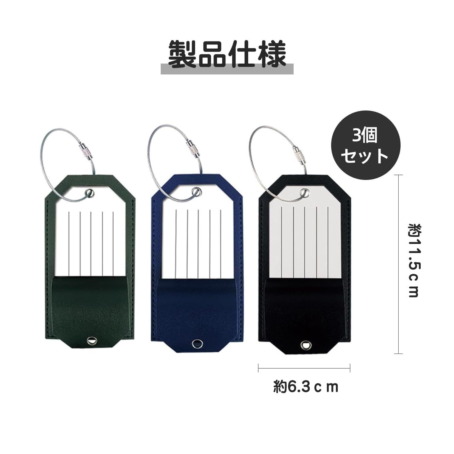 【包装】3色のスーツケース ネームタグ(黒*1+紺*1+深緑*1)をお届けします、サイズ規格は約11.5*6.3cmです。このラゲッジタグは色鮮やかで、たくさんの荷物の中から自分の荷物を簡単に見つけることができます。荷物が誤認されることがなく、紛失しても簡単に見つけることができるので、旅行の楽しさを感じることができます。