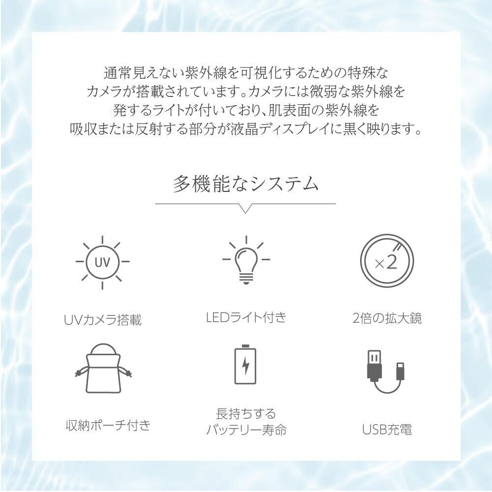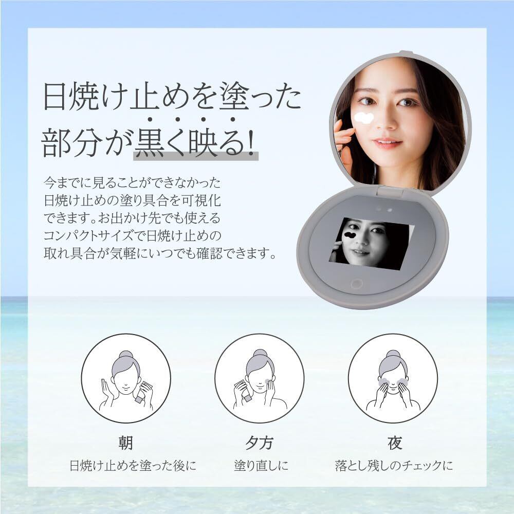 【日焼け止めを塗った所を視覚化】UVカメラとUV検出ミラーを使用すれば日焼け止めの跡が見えるので、塗り忘れがあればひと目で分かります。これらを使用する事で、日焼け止めを綺麗に塗ることが出来ます。