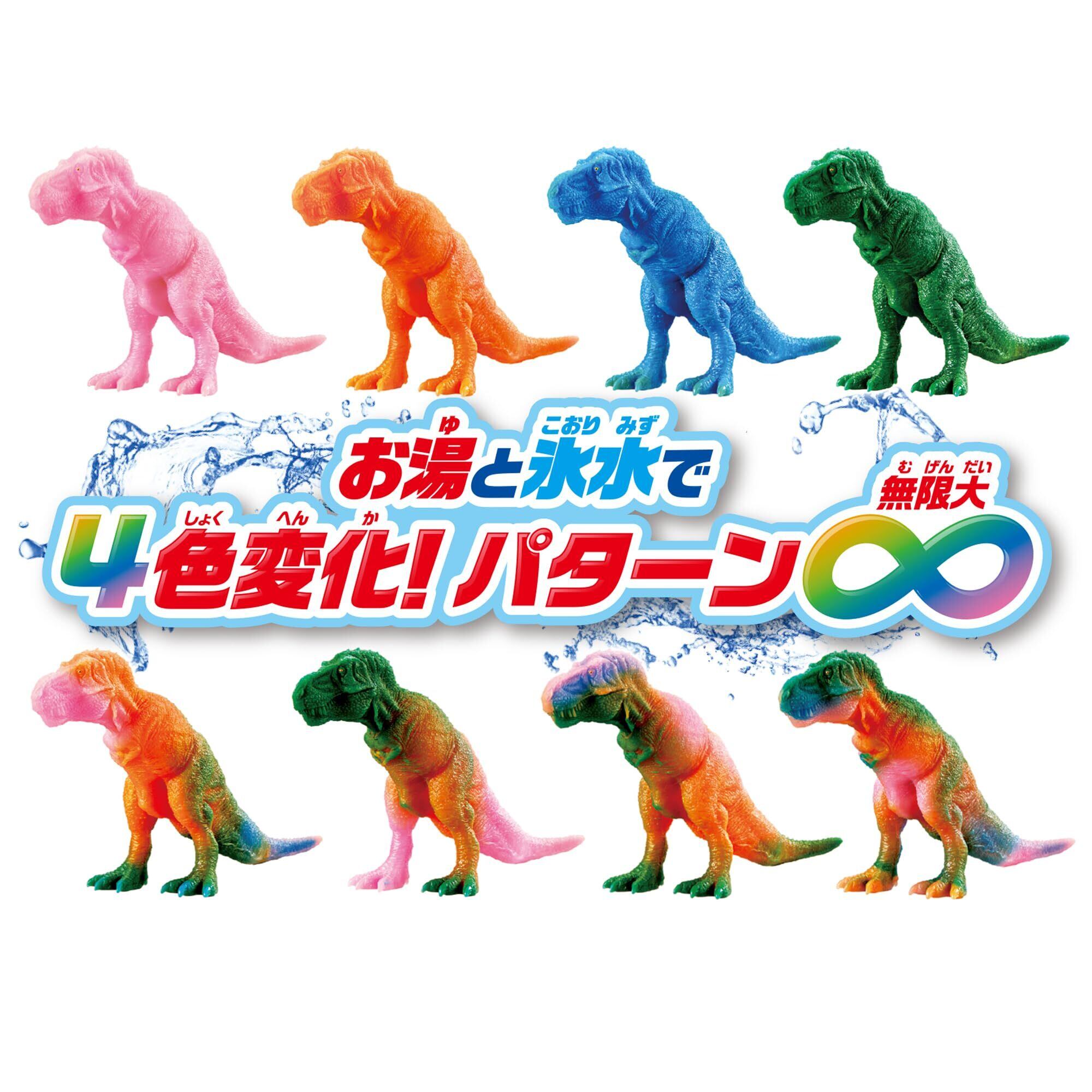 4色に色を変えてかっこいい恐竜を作り出せ!ティラノサウルスはお湯と氷水で4色に色が変わり、繰り返し色変え遊びができます。バトルフィールドはお風呂に浮き、恐竜を載せることができます。火山パーツは水を噴射でき、バトルフィールドに載せた恐竜を狙い撃つなど、バトル遊びができます。色変わりアイテムは化石をモチーフとし、恐竜の世界観を演出しています。