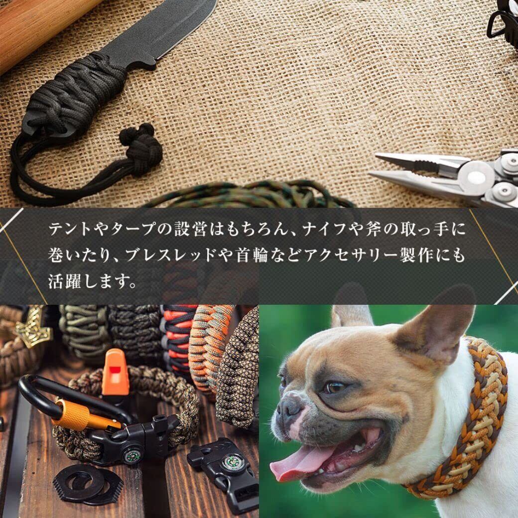 優れた耐久性と柔軟性があり、テントやタープの設営時のガイロープとしてはもちろん、パラコードブレスレッドなどアクセサリーの制作にも最適です。