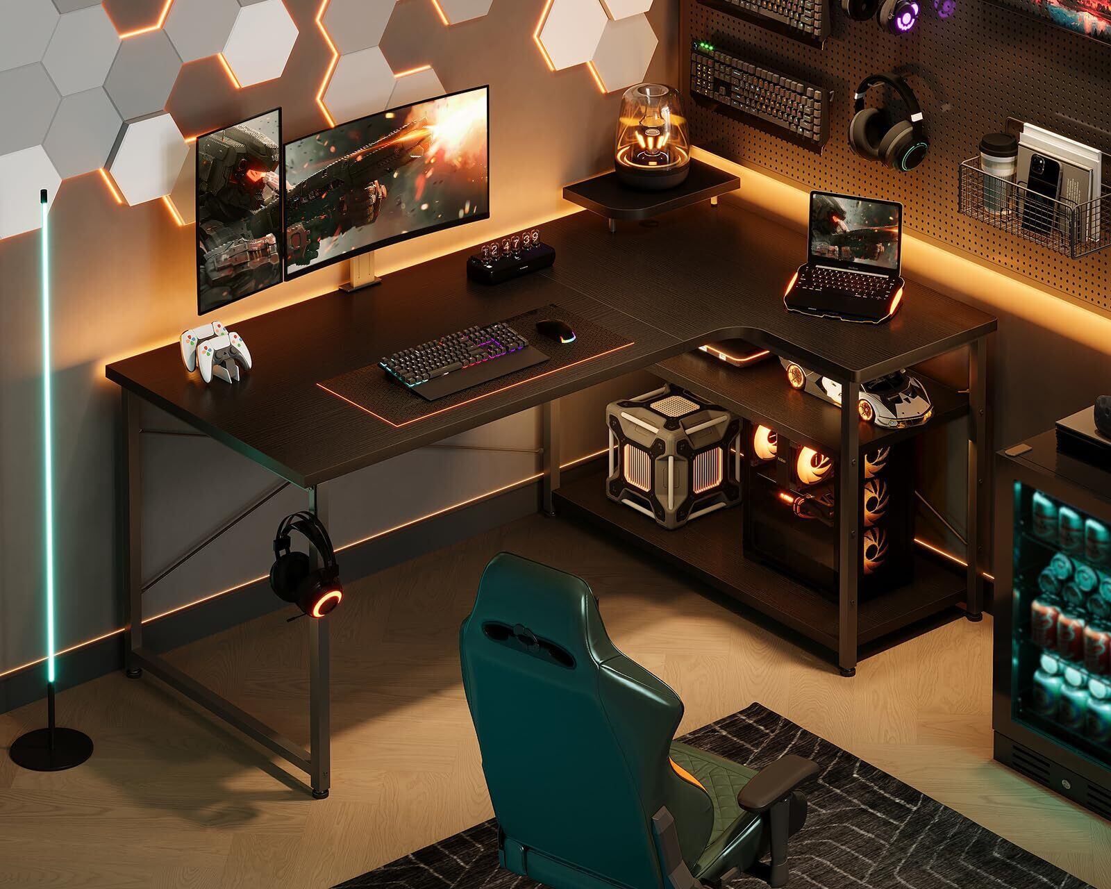 ODK ゲーミングデスク L字 パソコンデスク 幅110 デスク desk 机 pcデスク 棚付き オフィス ワーク 在宅勤務 桌子 勉強机 組立簡単 ブラック 右棚