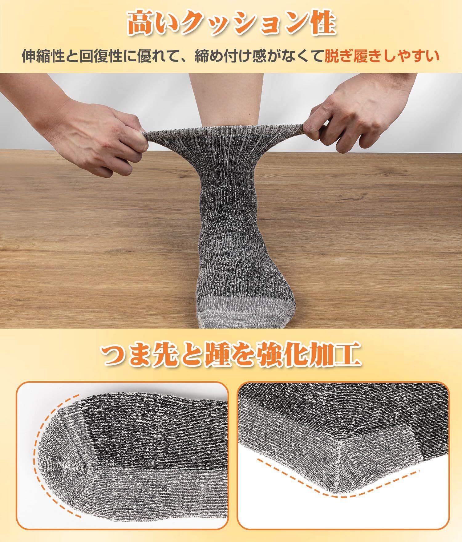 「毛玉が出来にくい」:当社独自開発のアクリルとウールを混ぜた素材を使用しており、抗ピル加工が施されていて毛玉を防いで、普通のウールソックスと比べて、着用を重ねても毛玉ができにくく安心して長く着用できます。※生地表面が摩擦試験5000回以上を実施しています。耐久性が高く、洗濯機で水洗いしても縮みや型崩れが起こりにくいです。