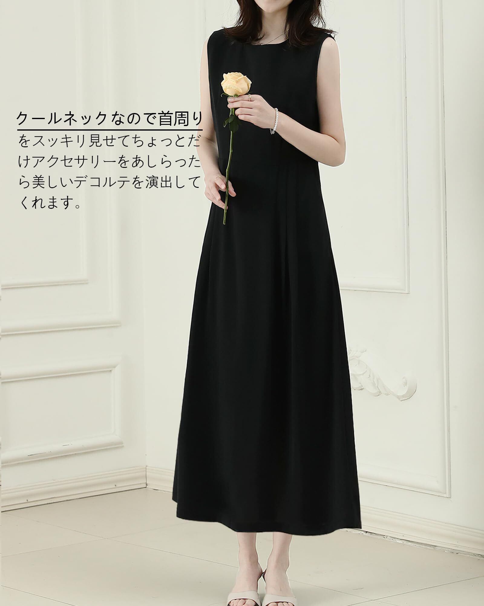 ◎着るだけで女性らしい雰囲気が溢れるレディースロングワンピースです。クールネックなので首周りをスッキリ見せてちょっとだけアクセサリーをあしらったら美しいデコルテを演出してくれます。右脇側にファスナーと後ろ背中に涙開けボタン設置しており、着脱ぎと着替えに便利です。ウェストタックが程よい立体感を引き立てます。膝下までのロング丈で歩くたびに揺れ揺れして知的でエレガントの印象に。涼しげなノースリーブのデザイン、夏に相応しいです。