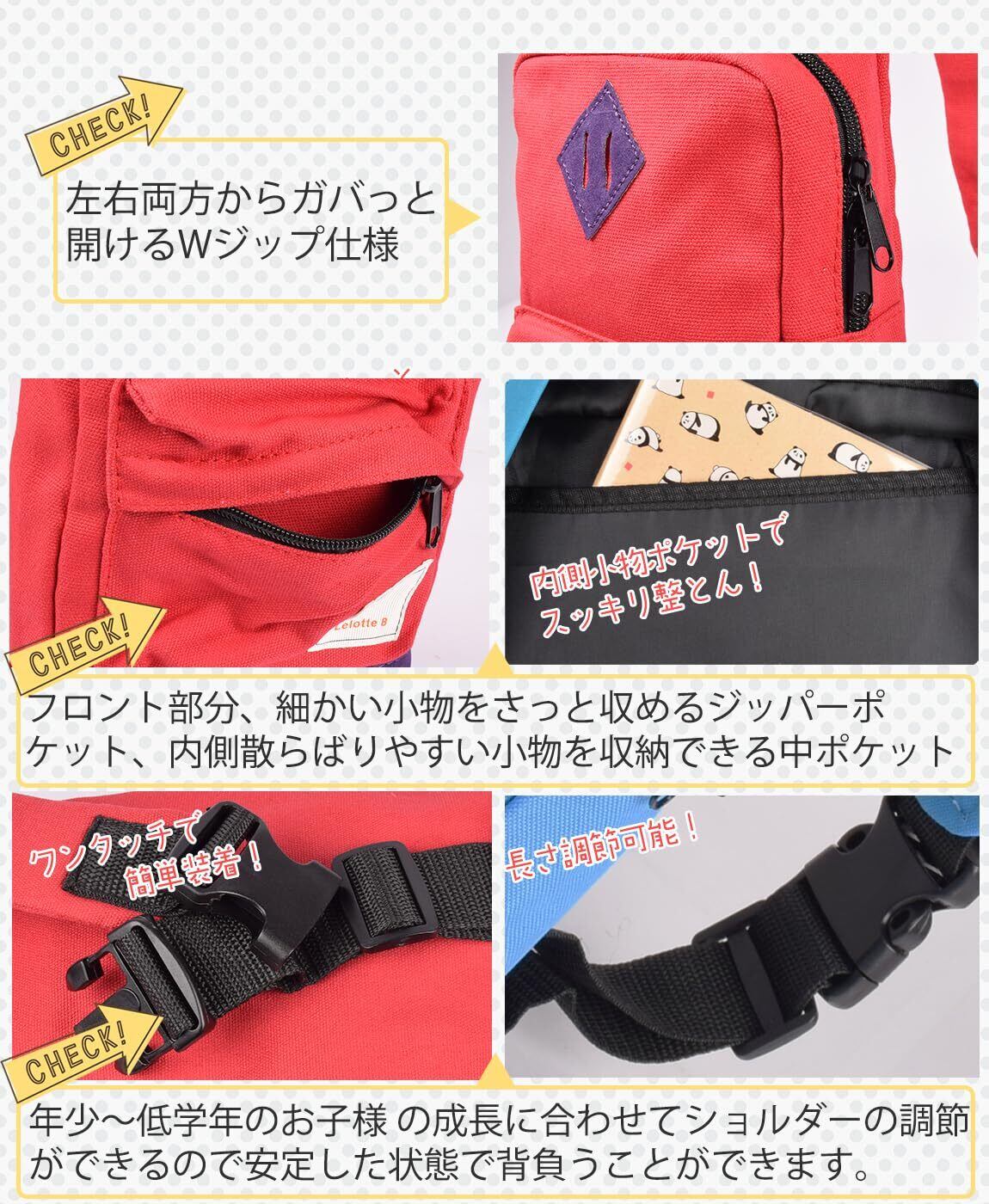 【軽量コットン素材】やわらかなコットン素材使用、無駄を省いた158gの軽量バッグなので、お子様の負担になることなくからう事ができます。機能面では、両方向から開け閉めできるダブルジップ仕様、表側にジップポケット、内側には 収納 に便利な仕分けポケットを配したシンプルなつくりです。