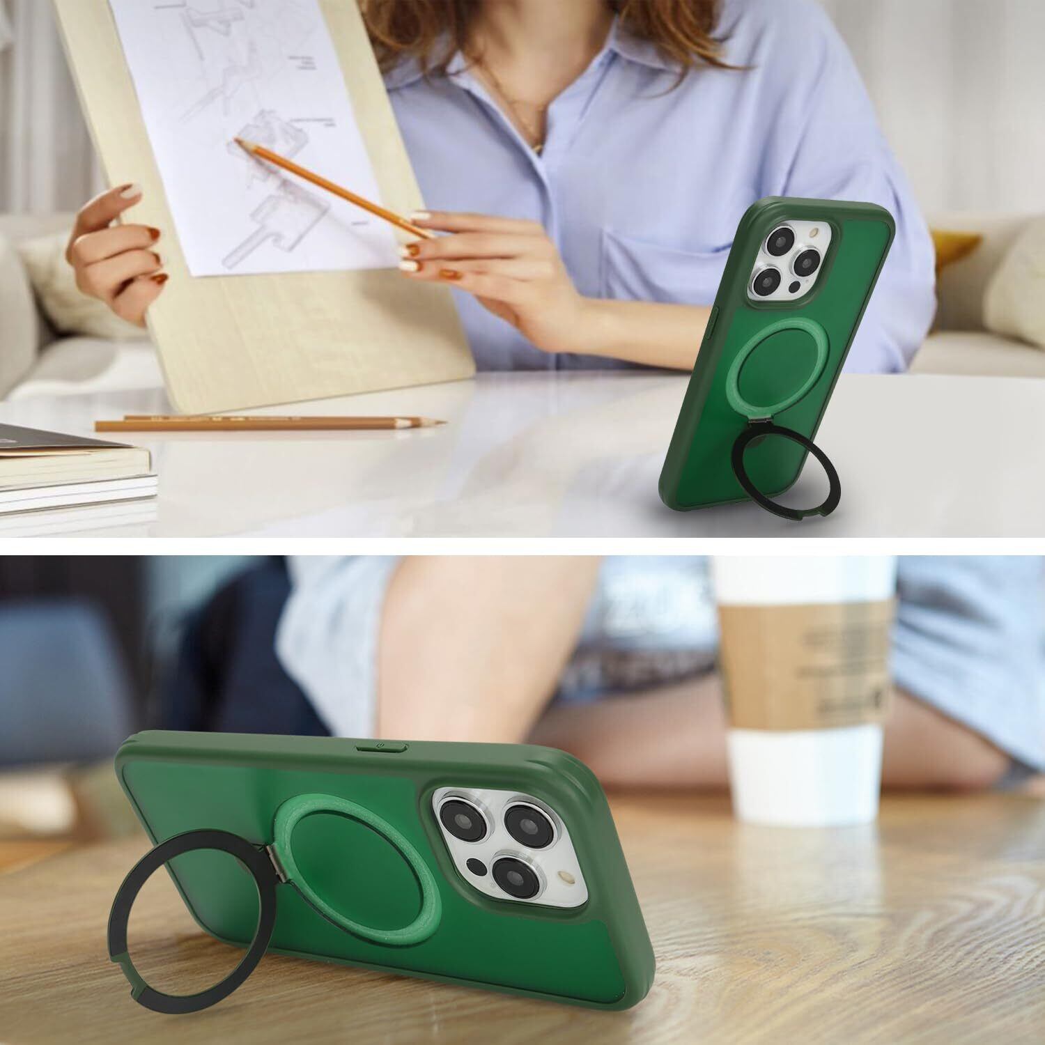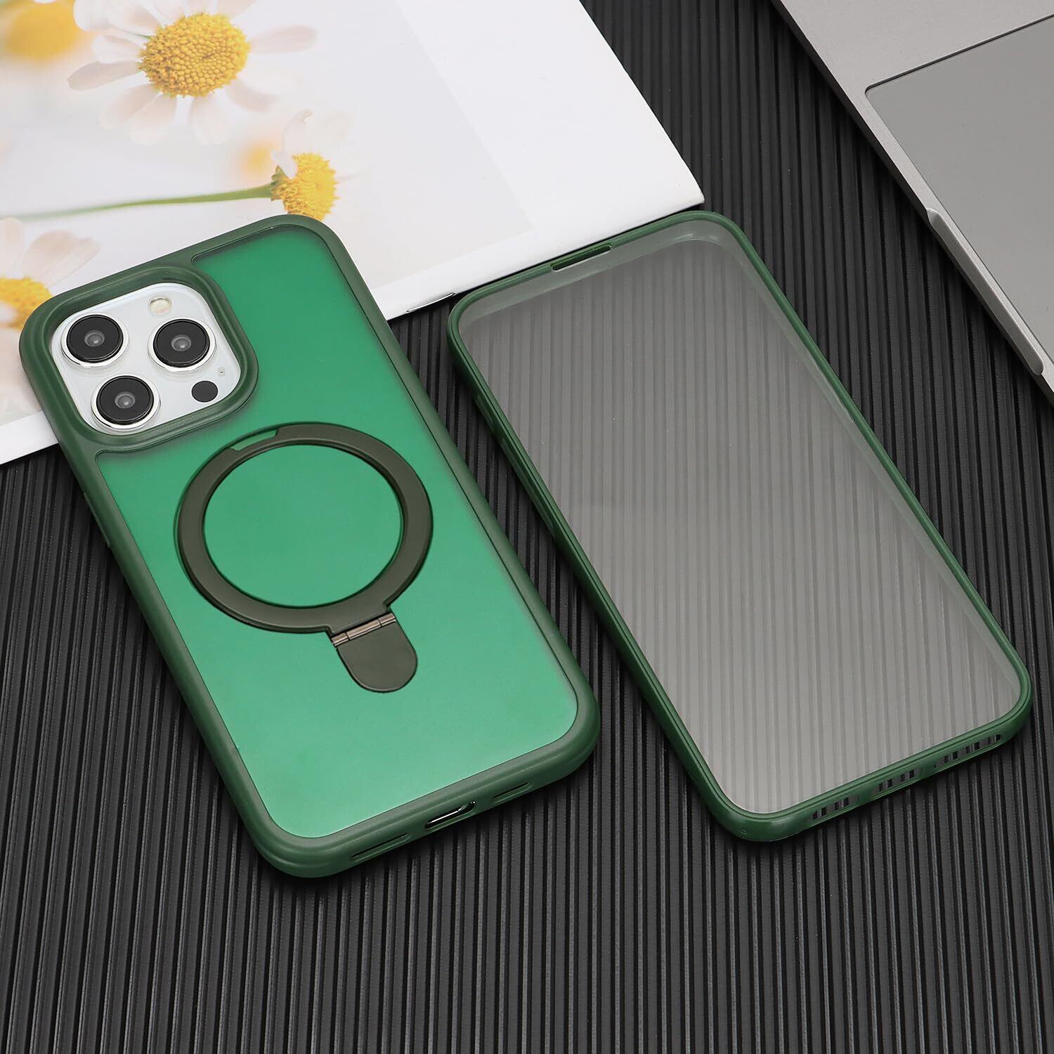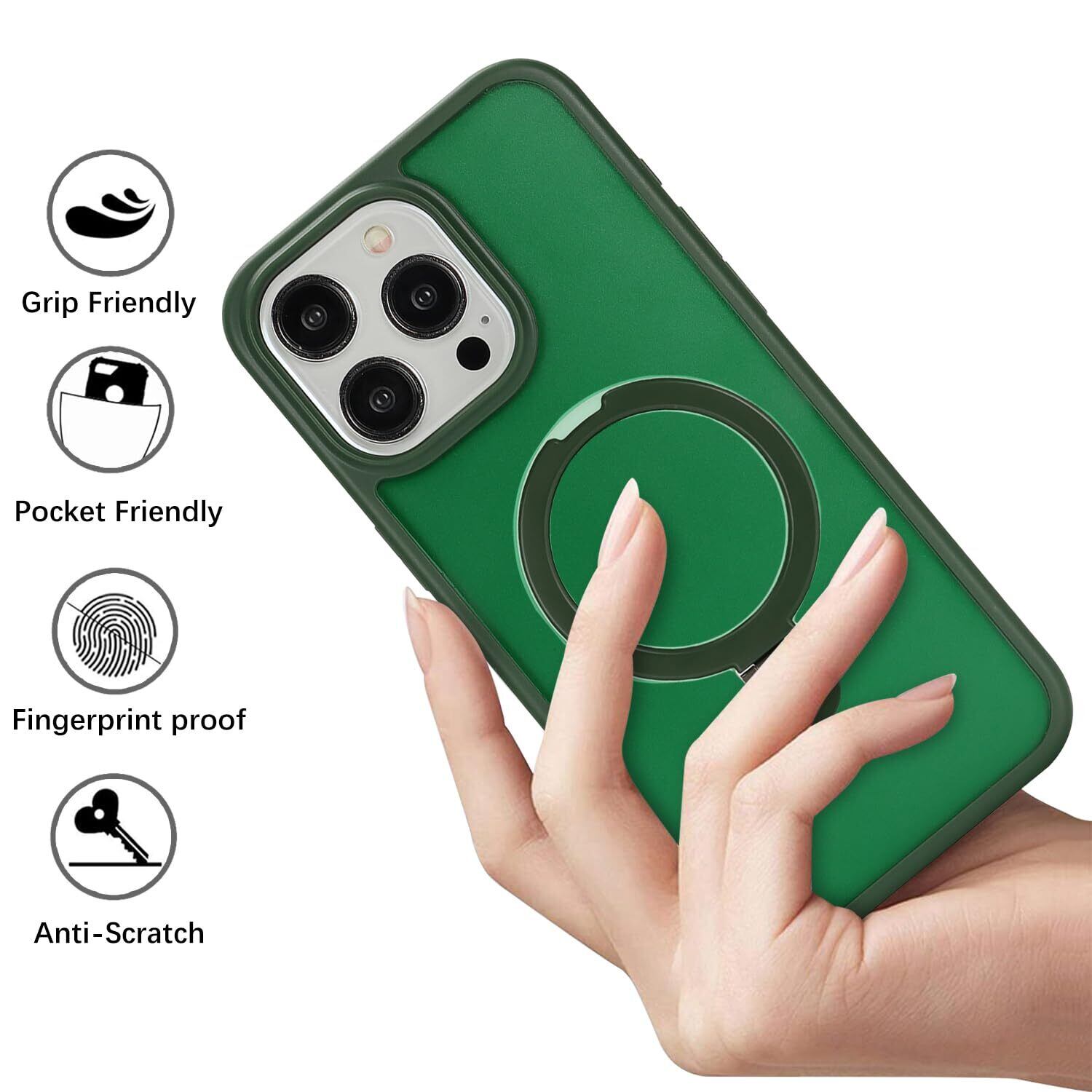 iPhone 15 Pro MaxケMagsafe対応 スタンドクリア 両面強化ガラスで全面保護 米軍耐衝撃 半透明 リング付き ワイヤレス充電対応 マット感 黄変防止 アイフォン 15 Pro Max 透 ケース・スマホケース iPhone 15 ProMax 人気 6.7インチ(緑)