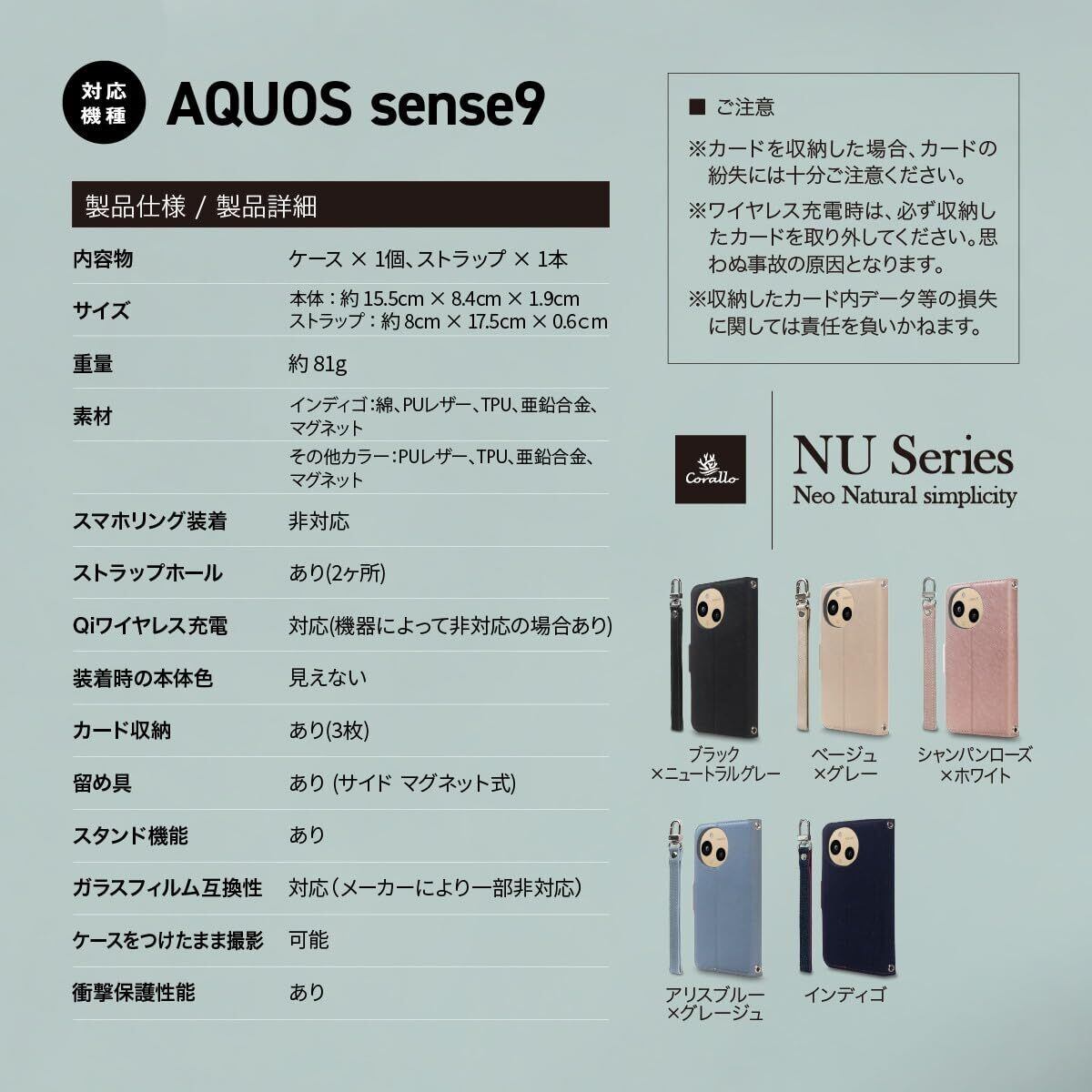 【製品仕様】… ◆ 対応機種 : AQUOS sense9 sense10 アクオスセンス9 アクオスセンス10 ◆ 内容物 : ケース × 1個、ストラップ × 1本 ◆ サイズ : 約 15.5cm × 8.4cm × 1.9cm ◆ 重量 : 約 81g ◆ 素材 : インディゴ:綿、人工皮革、TPU、亜鉛合金、マグネット その他カラー:人工皮革、TPU、亜鉛合金、マグネット