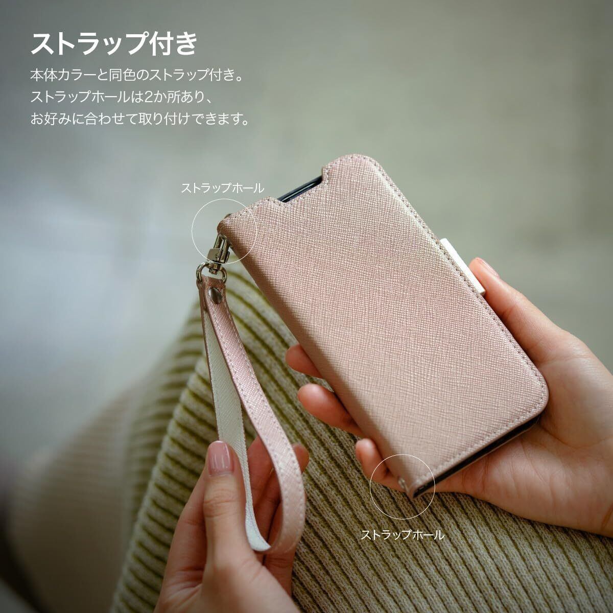【ストラップ付】… 本体カラーと同色のストラップ付きです。ストラップホールは2か所あり、お好みに合わせて取り付け可能です。