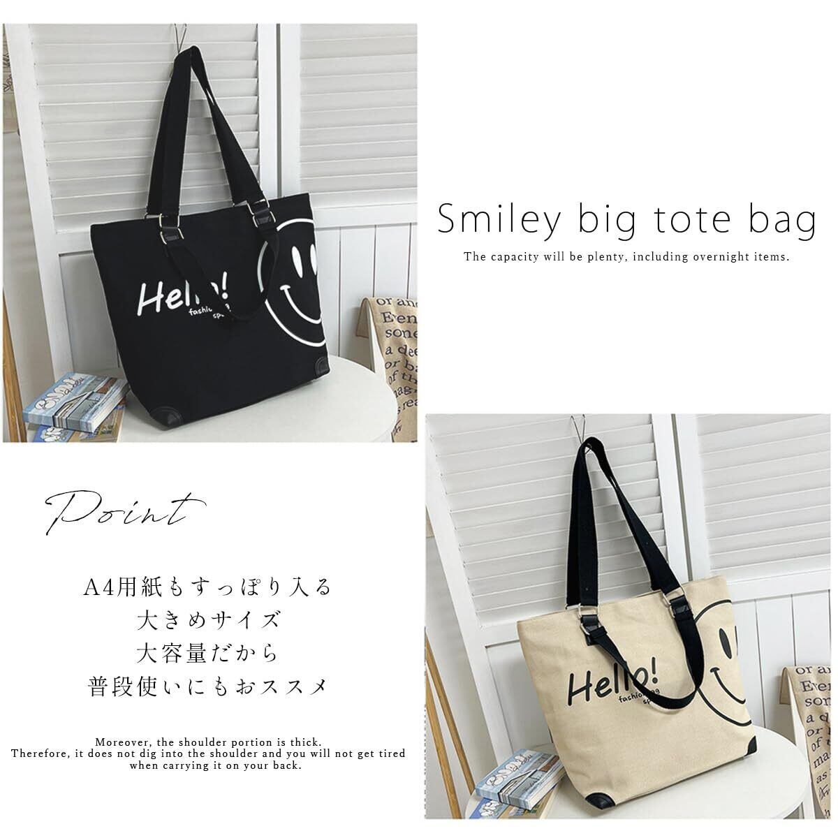 [DIVA Rose] トートバッグ レディース キャンバス ハンドバッグ 大きめ かわいい 大容量 手提げ 帆布 バッグ おしゃれ 軽い スマイルビッグトート
