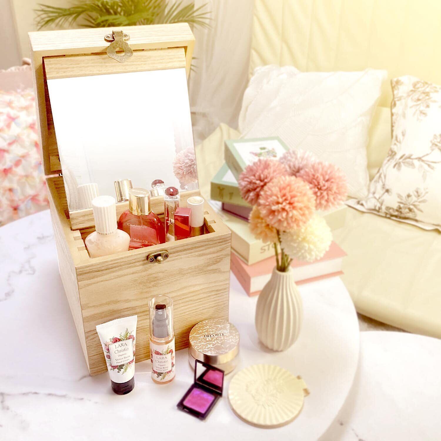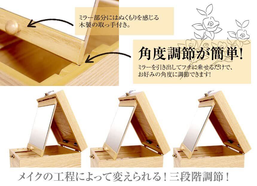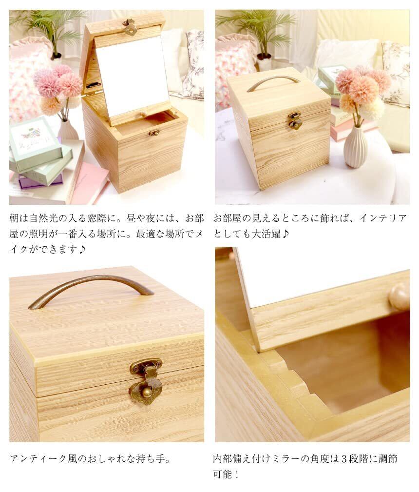 朝は自然光の入る窓際に。昼や夜には、お部屋の照明が一番入る場所に。最適な場所でメイクができます。お部屋の見えるところに飾れば、インテリアとしても大活躍!シンプルかつ、どんなお部屋にも馴染む北欧風のメイクボックスは、年代問わず人気のデザインです。